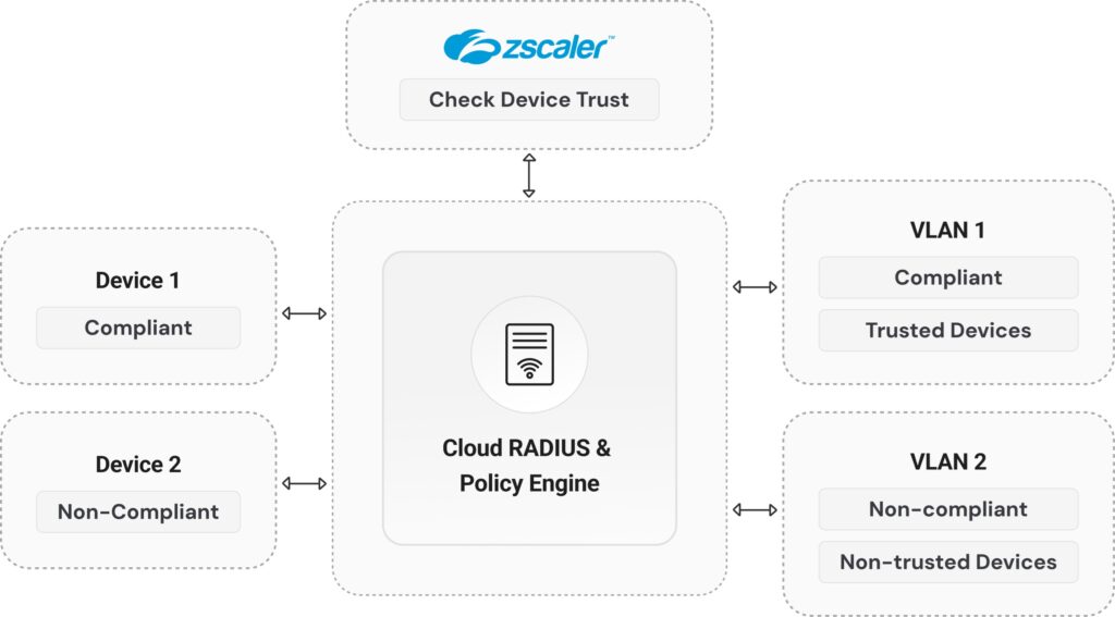 SecureW2 now directly integrates with Zscaler to utilize its device trust signals, ensuring device compliance and security posture during certificate enrollment and RADIUS authentication.