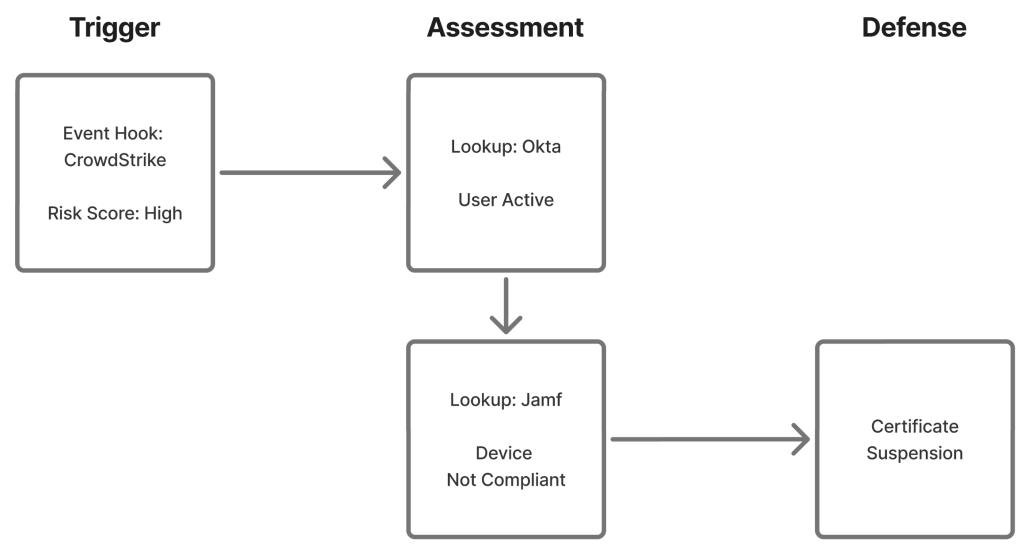 This live, condition-aware approach ensures continuous trust enforcement by aligning certificate validity to real-time conditions, enabling automated suspension, reactivation, revocation, or reissuance without manual tracking or renewal workflows, thereby operationalizing zero trust’s principle across network, SSO, cloud, and workload access.