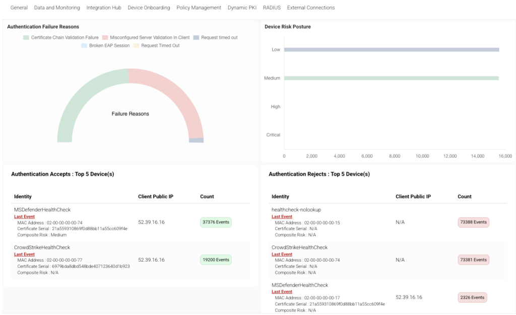 Intelligence Briefs is a combination of comprehensive dashboards and notification/alarm capabilities that are aimed at helping improve the resolution/troubleshooting of enrollment/authentication issues, as well as identify potential security vulnerabilities. They are divided into two categories, one for RADIUS and the other for PKI.