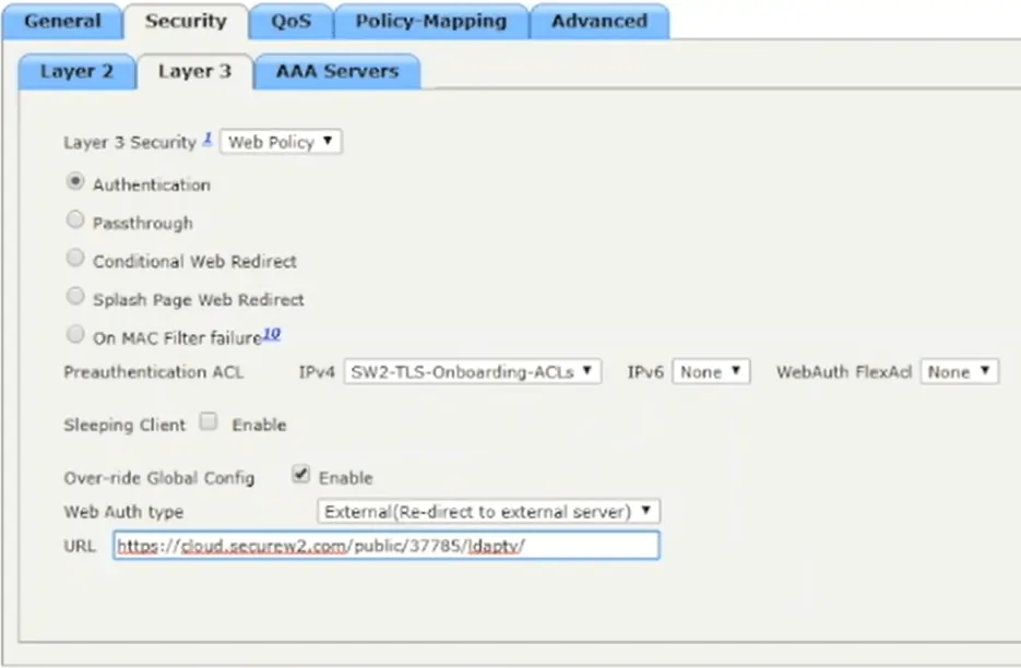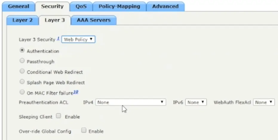 - Click the Layer 3 tab, and in the Layer 3 Security dropdown menu, select Web Policy.