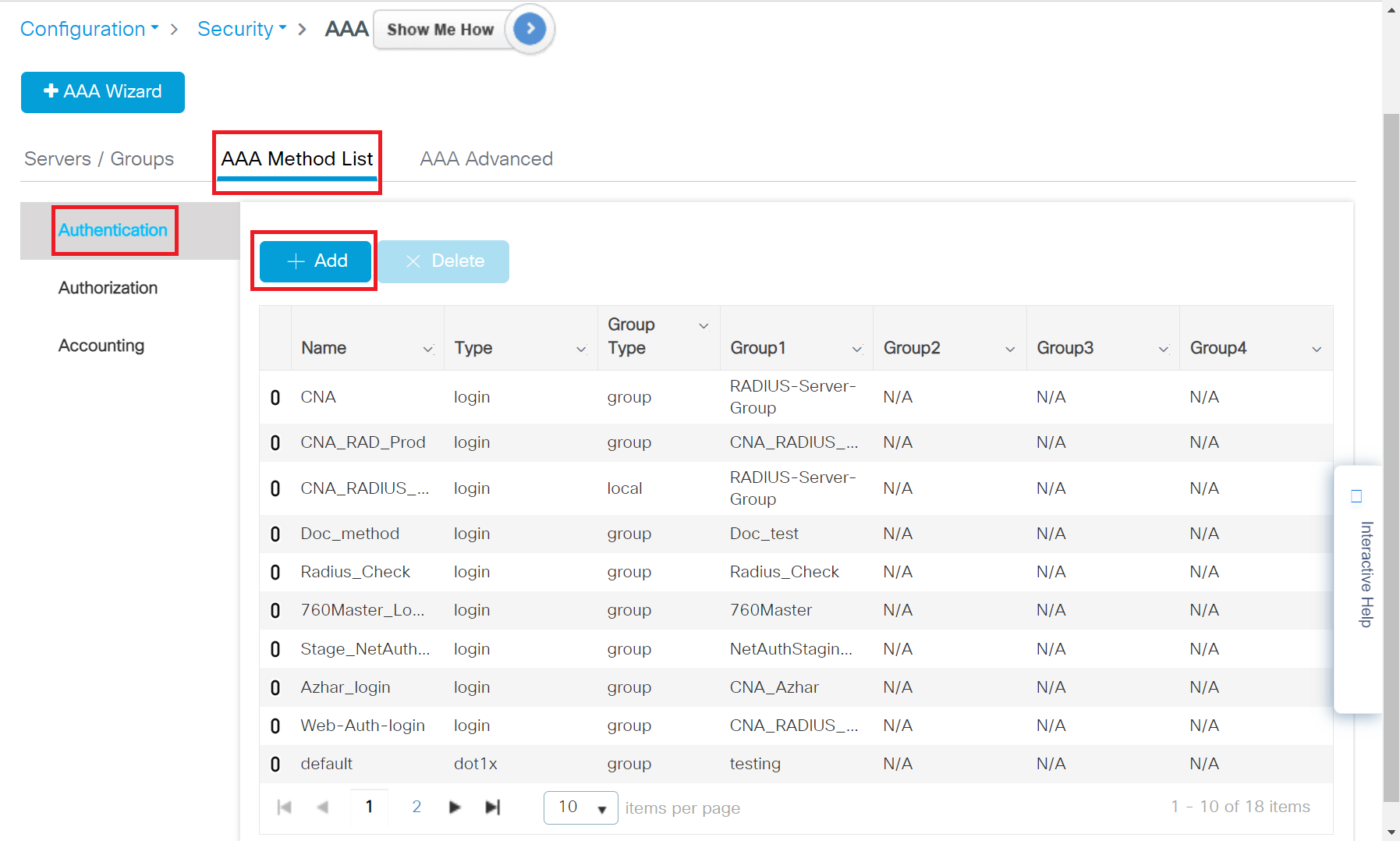 - Under the AAA Method List tab, click Authentication and then click + Add.