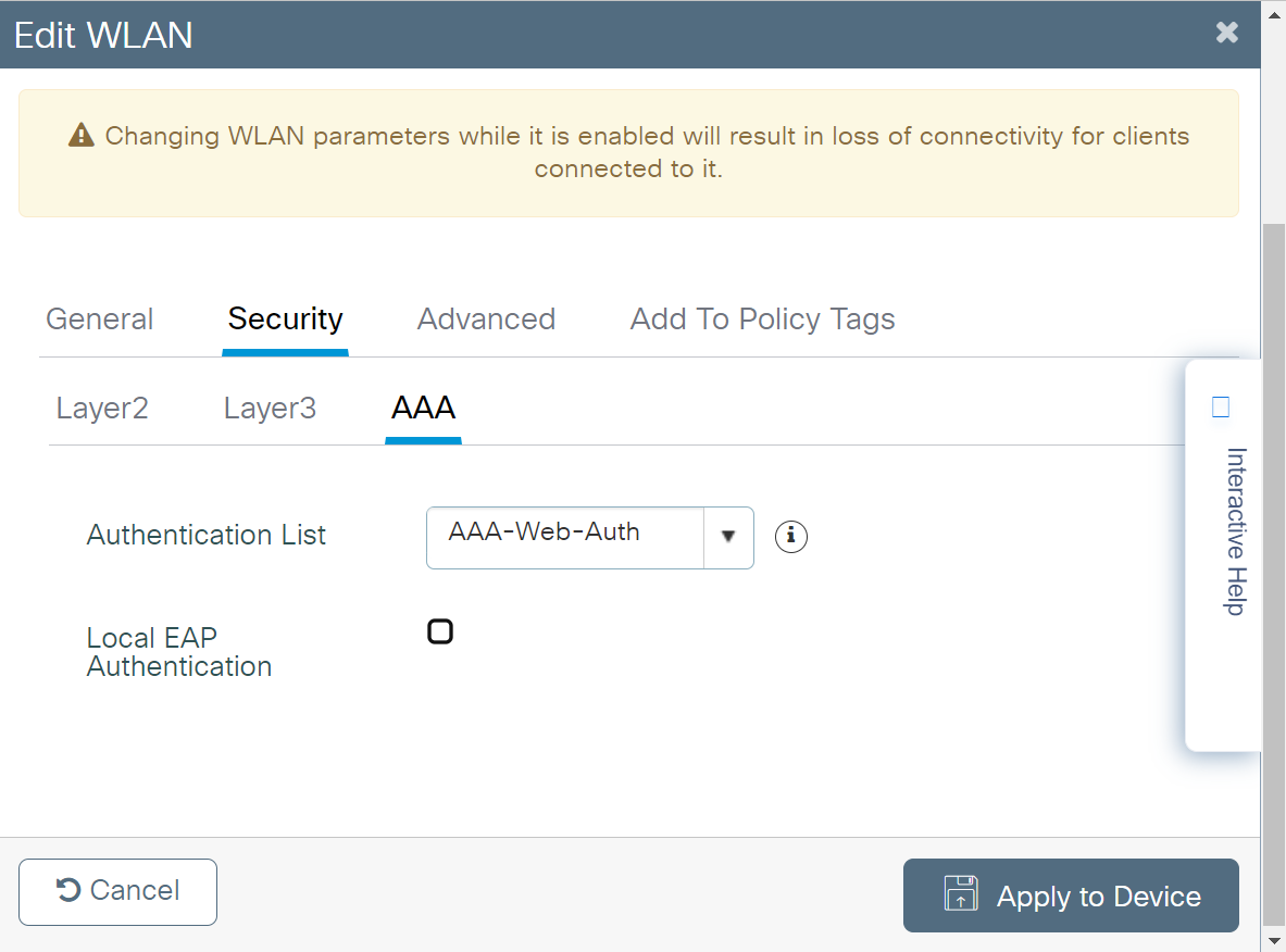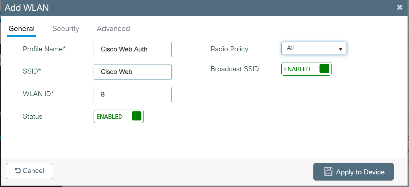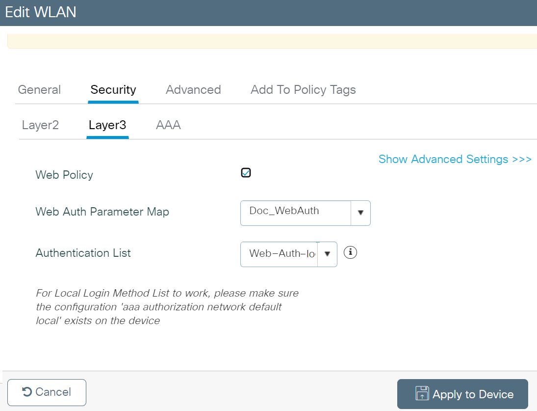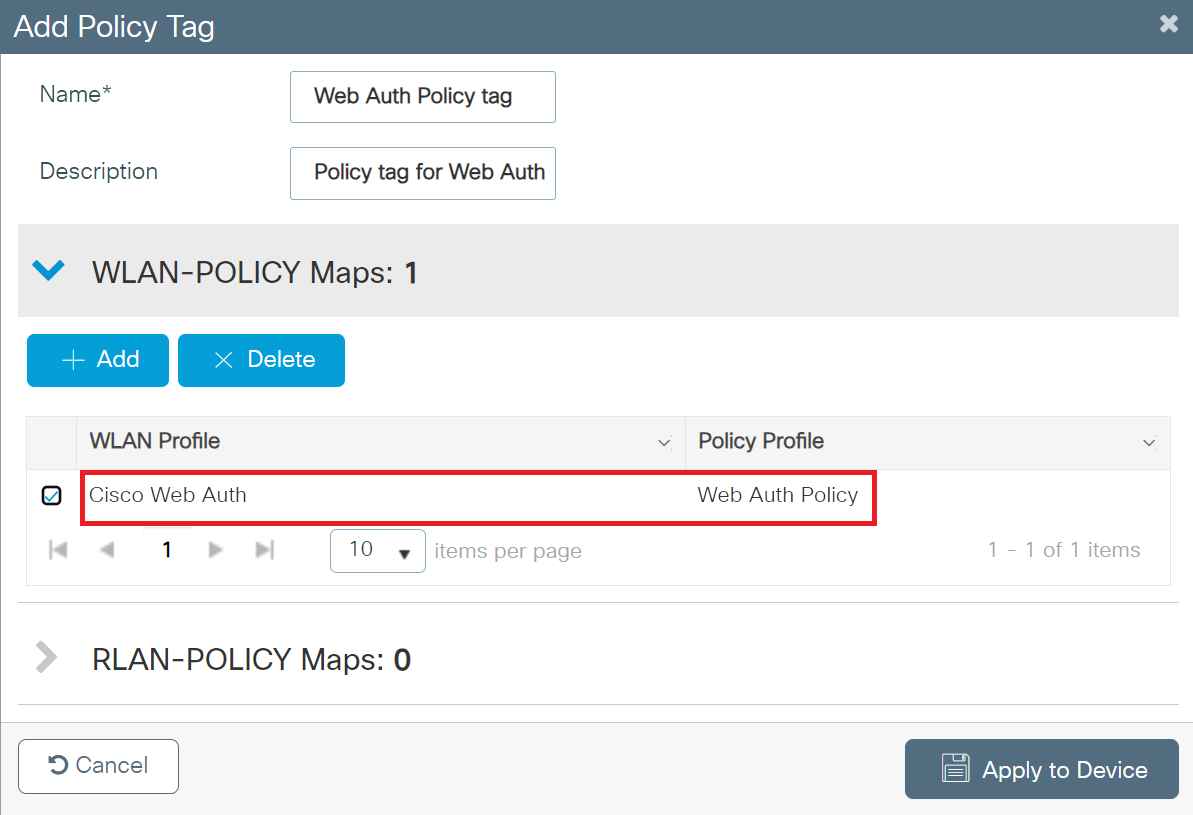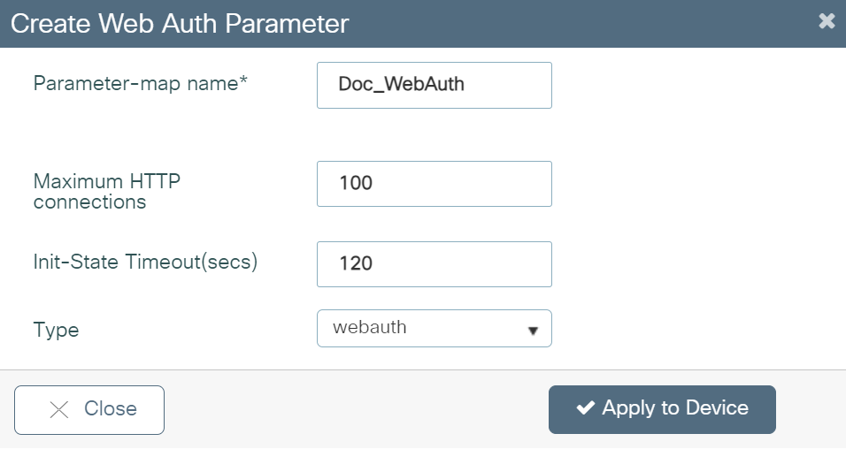 - Click Apply to Device. The newly created parameter map appears in the list of parameter maps on the Web Auth page.