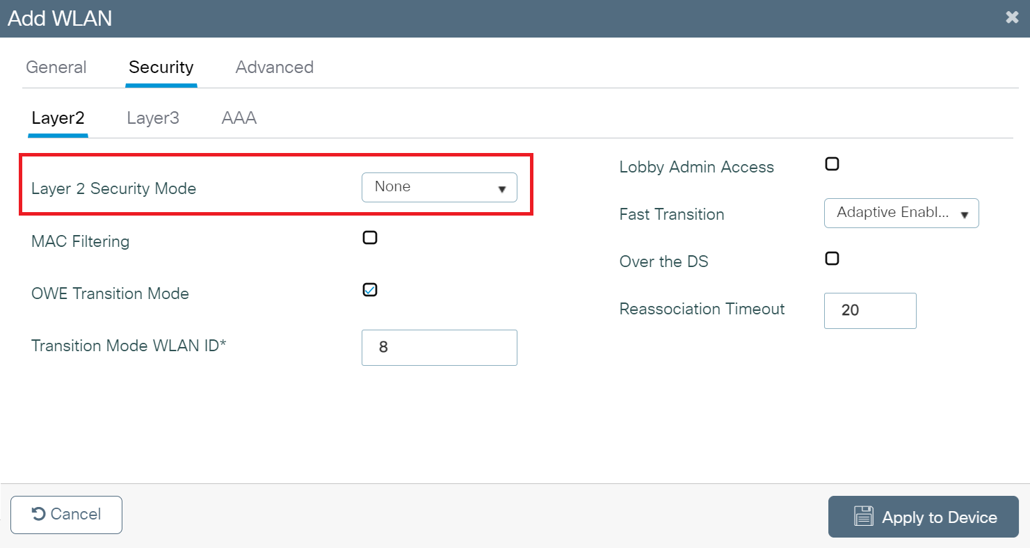 - Go to the Security tab, then under the Layer2 tab, in the Layer 2 Security Mode drop-down list, choose None. For web authentication, disable all Layer 2 security features.