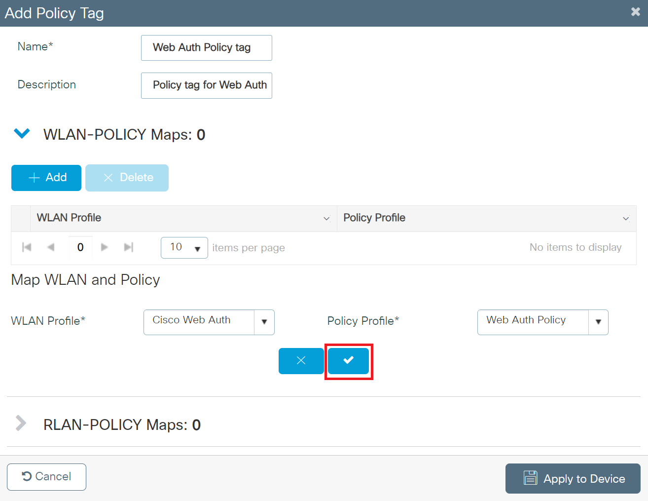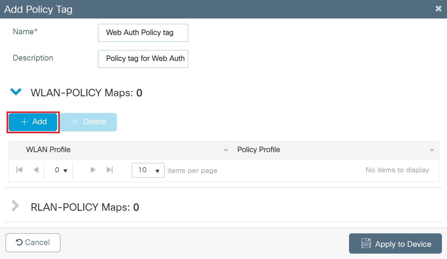 - Expand WLAN-POLICY Maps and click + Add.