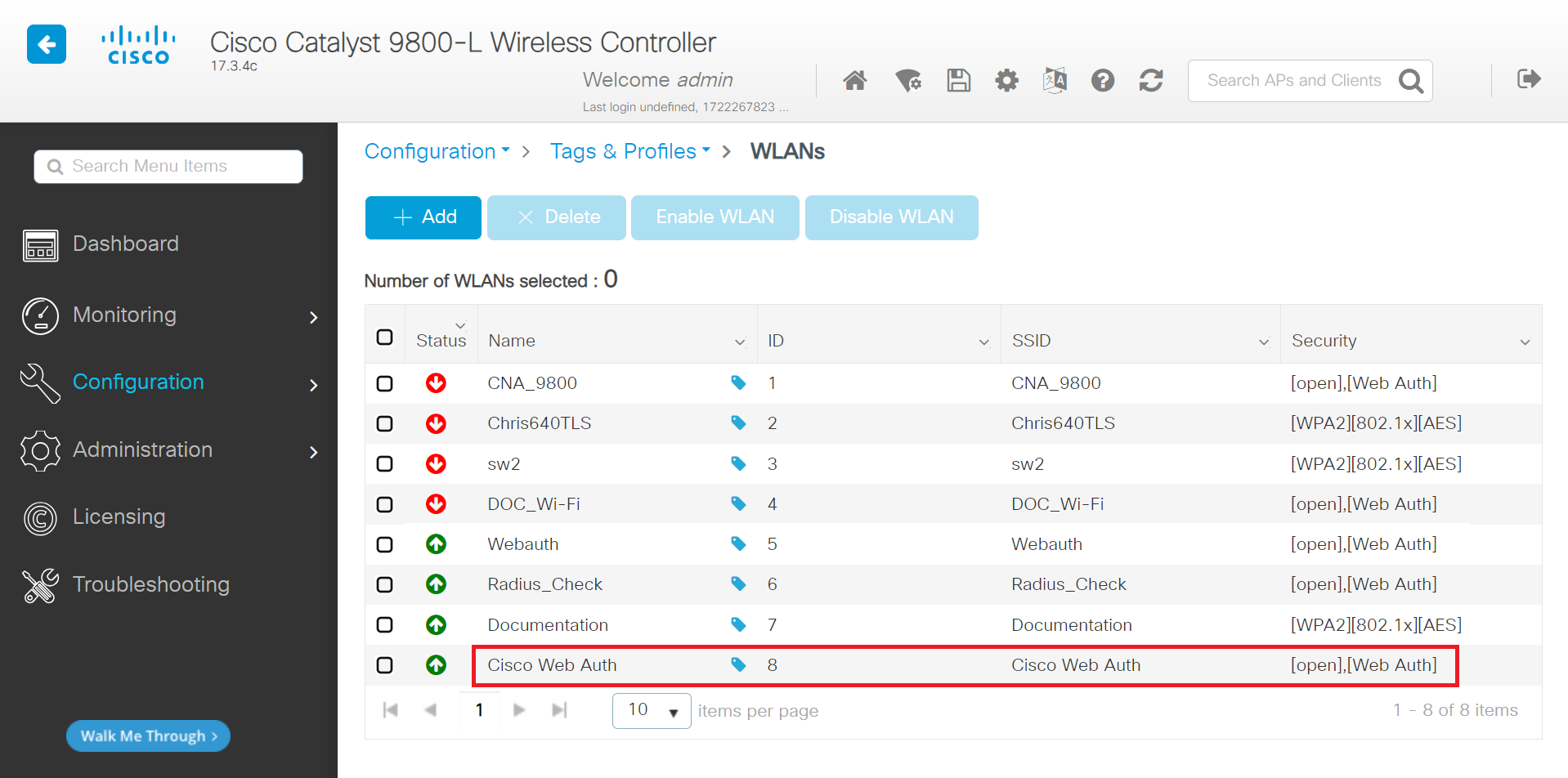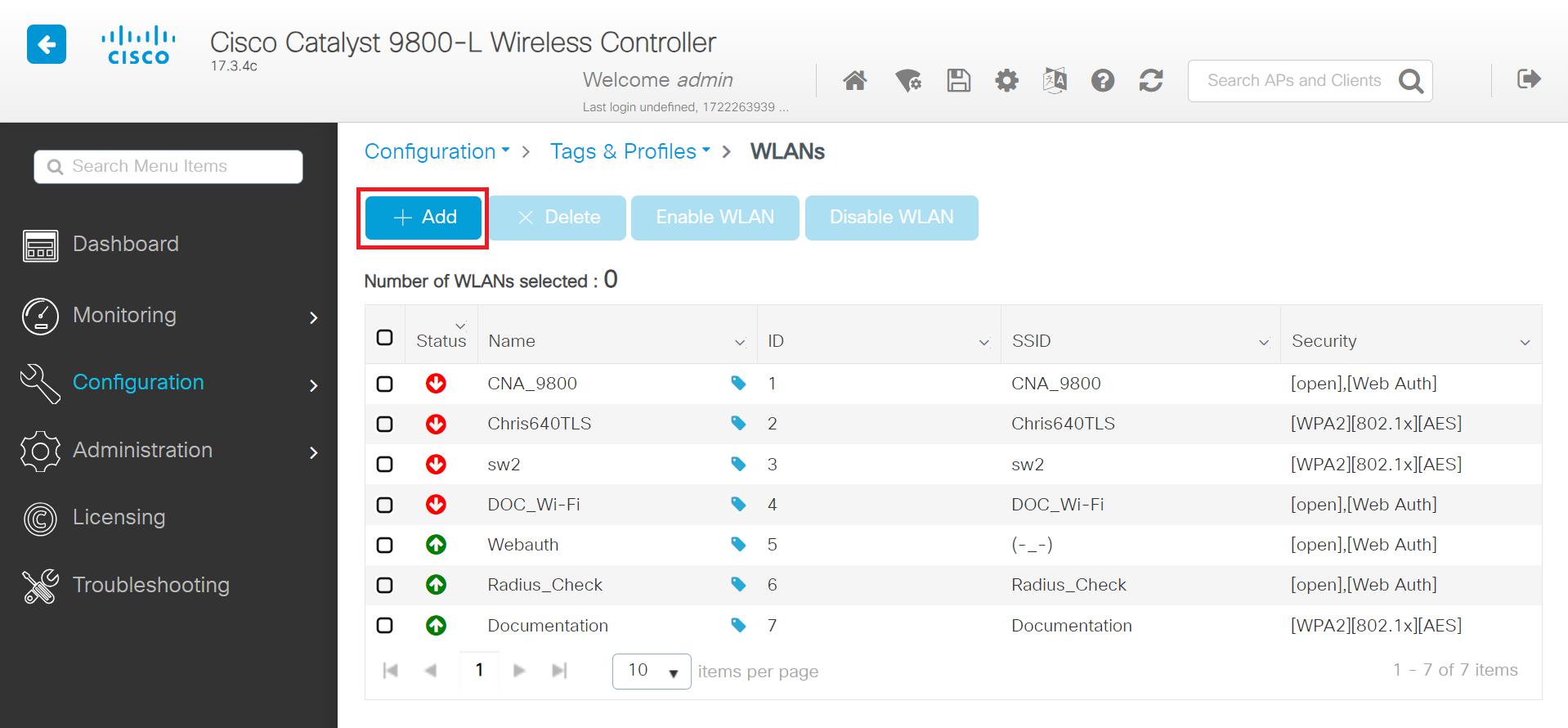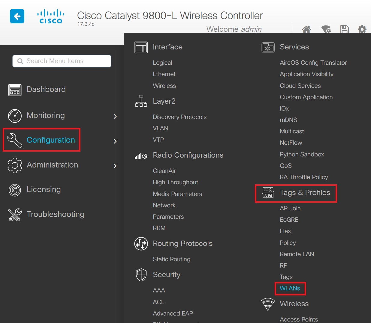 - Navigate to Configuration > Tags & Profiles > WLANs.