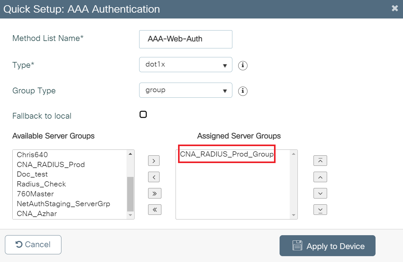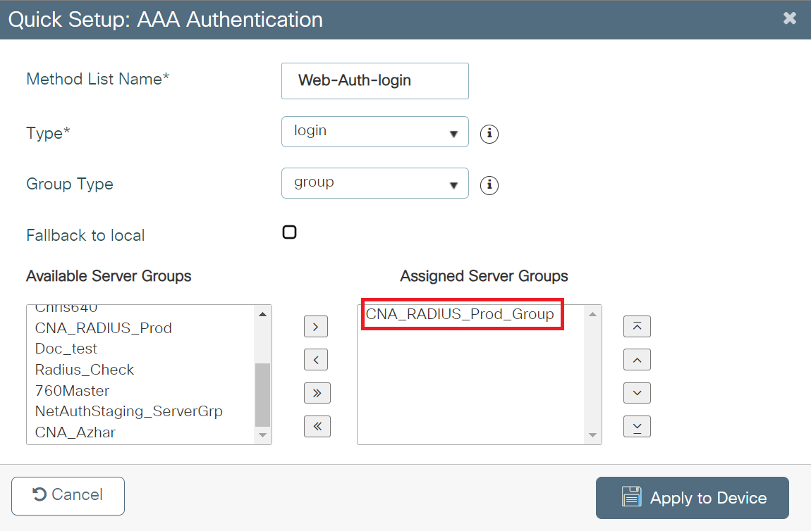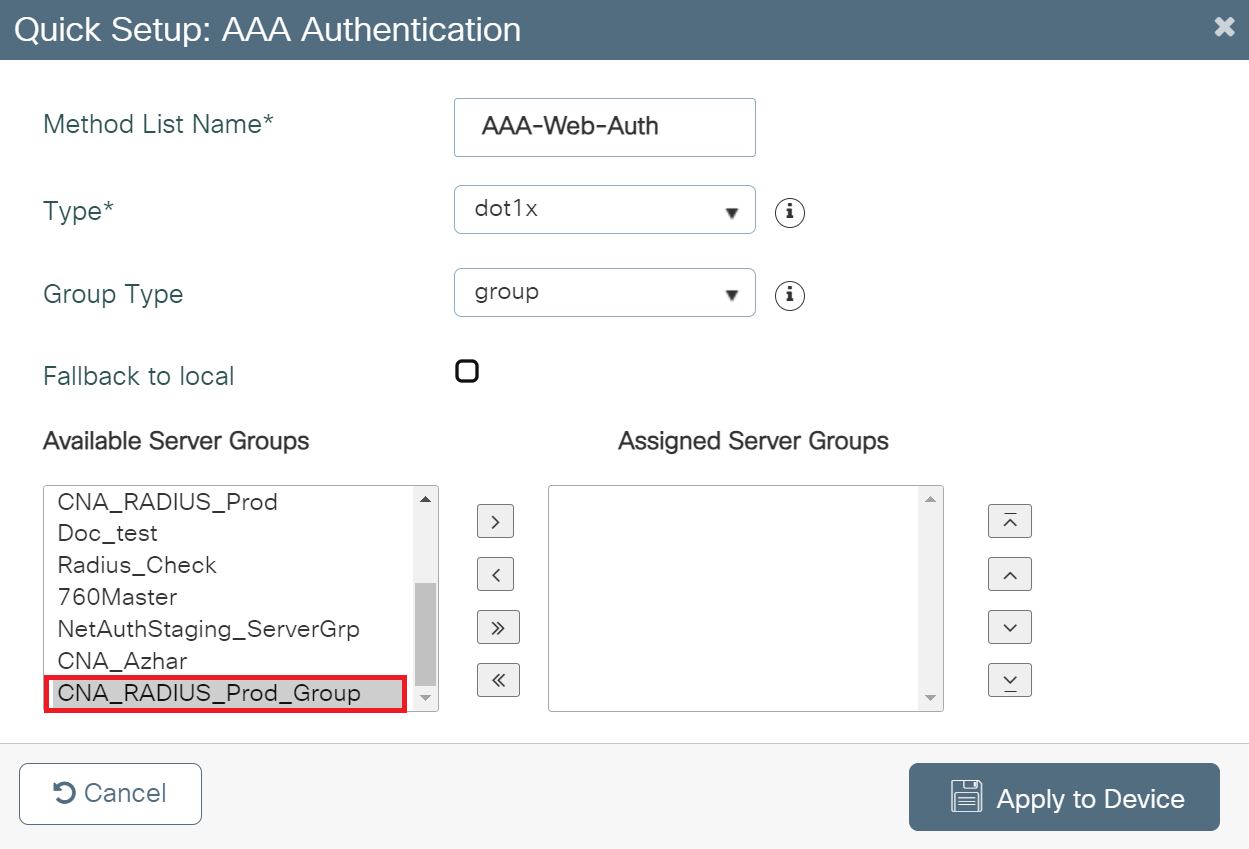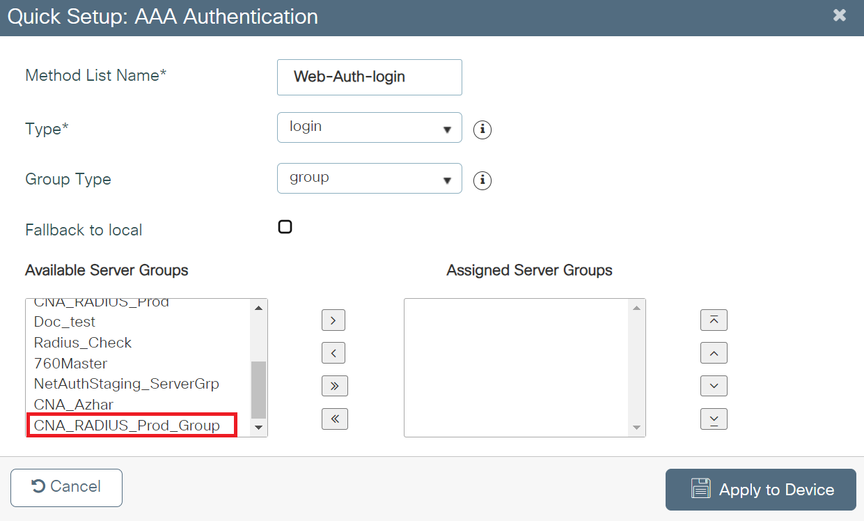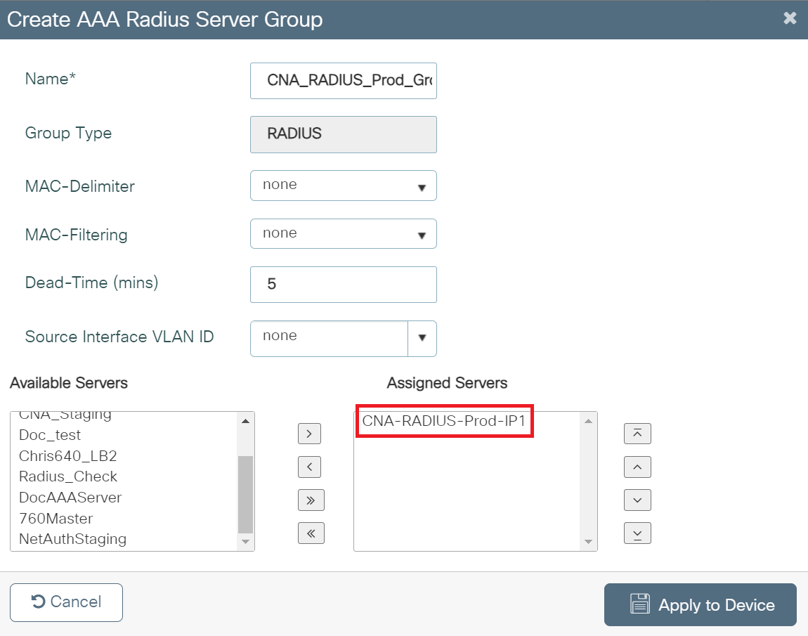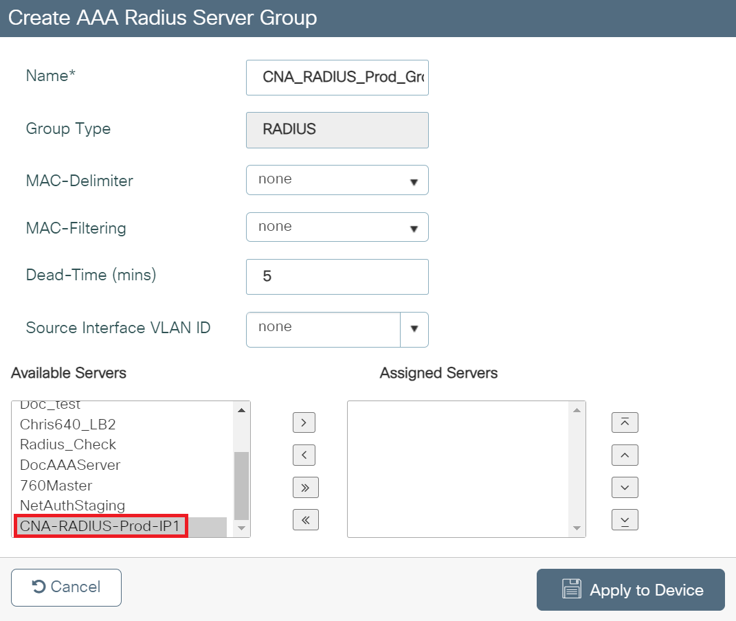 - From the Available Server Groups list, add the server group created in the Adding RADIUS Server to a Server Group section to the Assigned Server Groups list.
