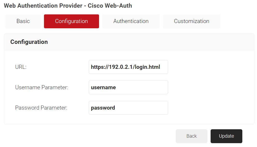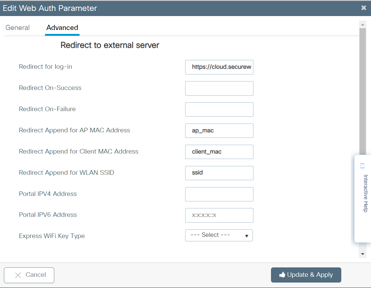 - In the URL field, enter https://192.0.2.1/login.html. This redirect URL is specific to Cisco.