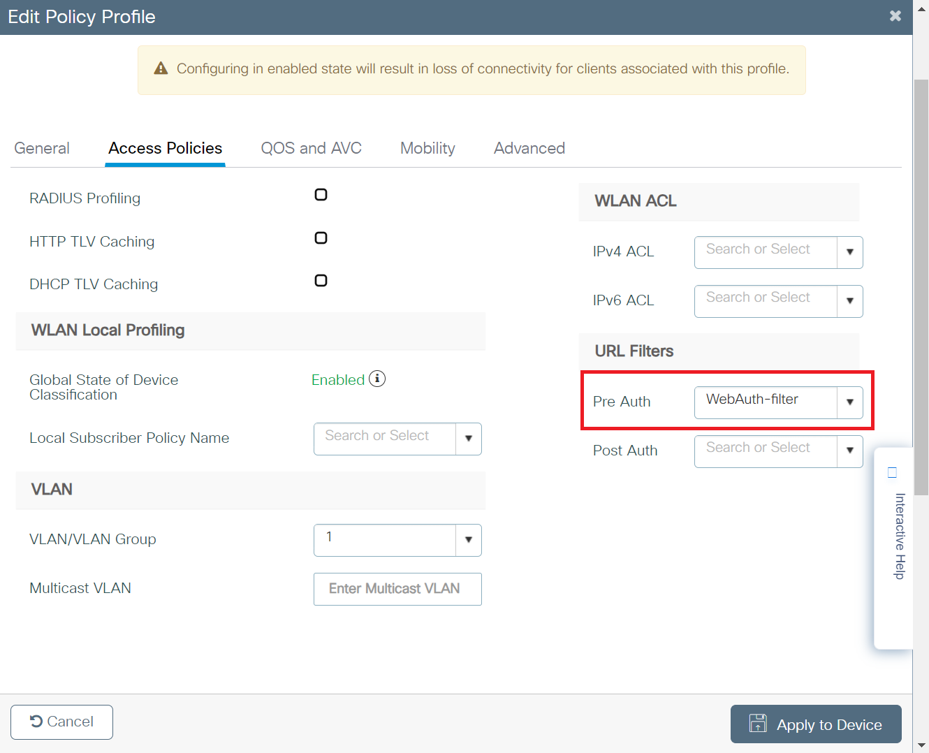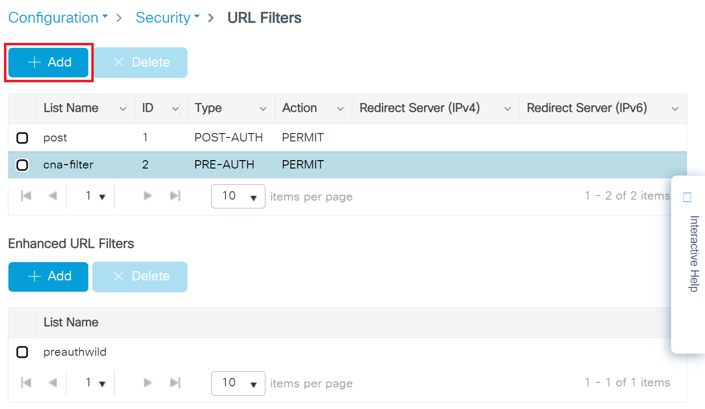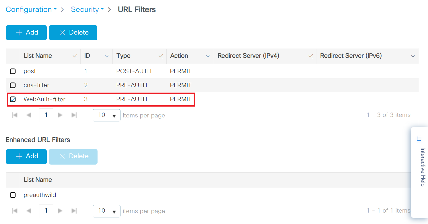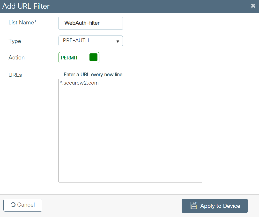- In the URL Filters section, from the Pre Auth drop-down list, select the Pre-Auth url filter created in the Configuring the URL Filter List section.