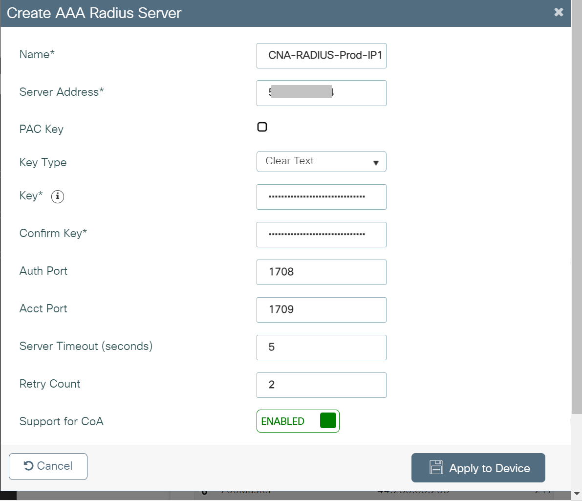 - On the Create AAA RADIUS Server pop-up window, configure the following details: