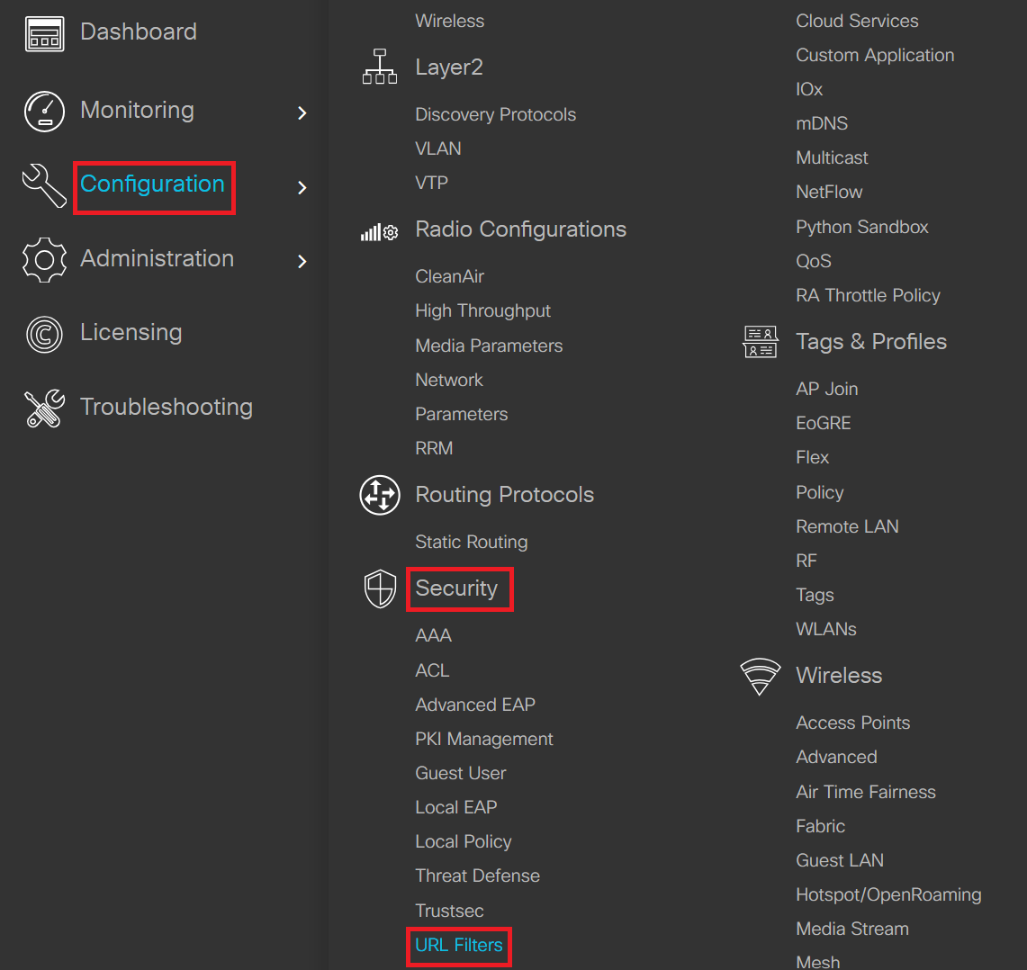 - Navigate to Configuration > Security > URL Filters.