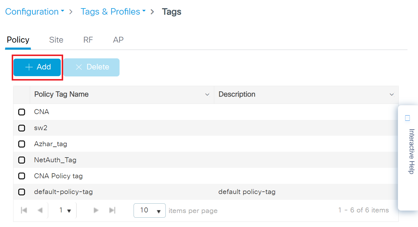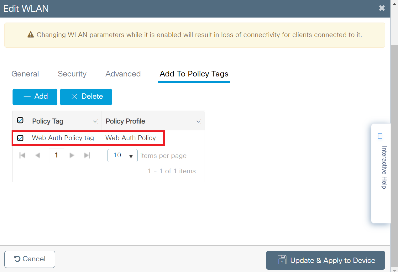 - Click the Add To Policy Tags tab. The Policy Tags are assigned to the WLAN profile, as shown in the screenshot below.