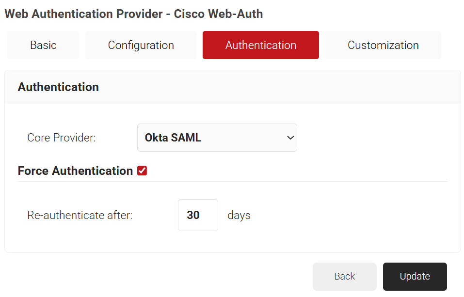 - In the Authentication section, from the Core Provider drop-down list, select the core provider created earlier in the Creating a CoreProvider section.