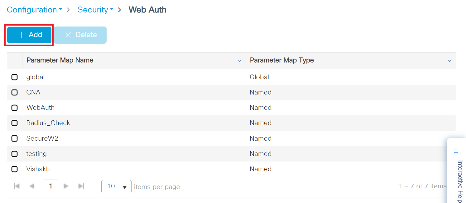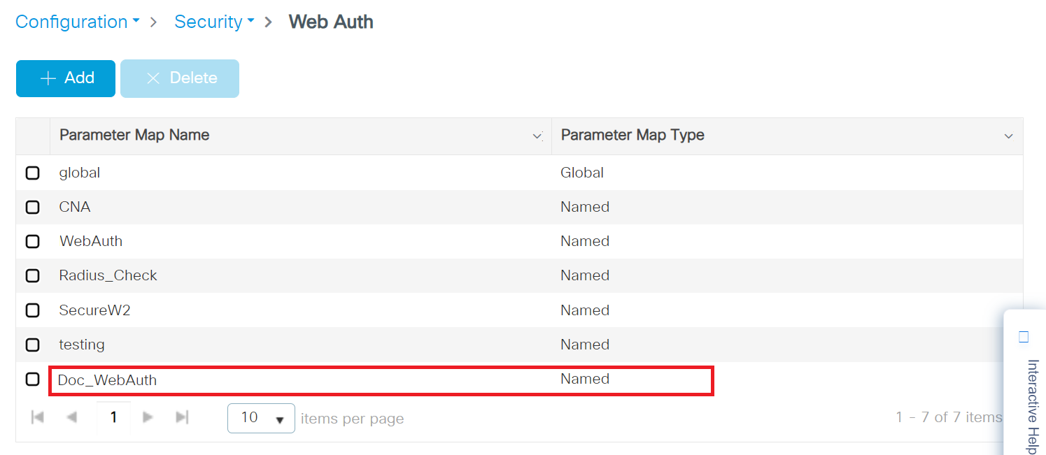 - On the Web Auth page, click the name of the parameter map that you created earlier (refer to step 2).
