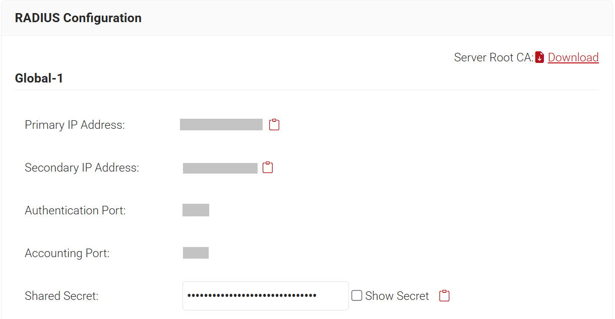 - To obtain the AAA configuration details from the JoinNow Management Portal, navigate to RADIUS > RADIUS Configuration. Copy the Primary IP Address, Authentication Port, Accounting Port, and Shared Secret values.
