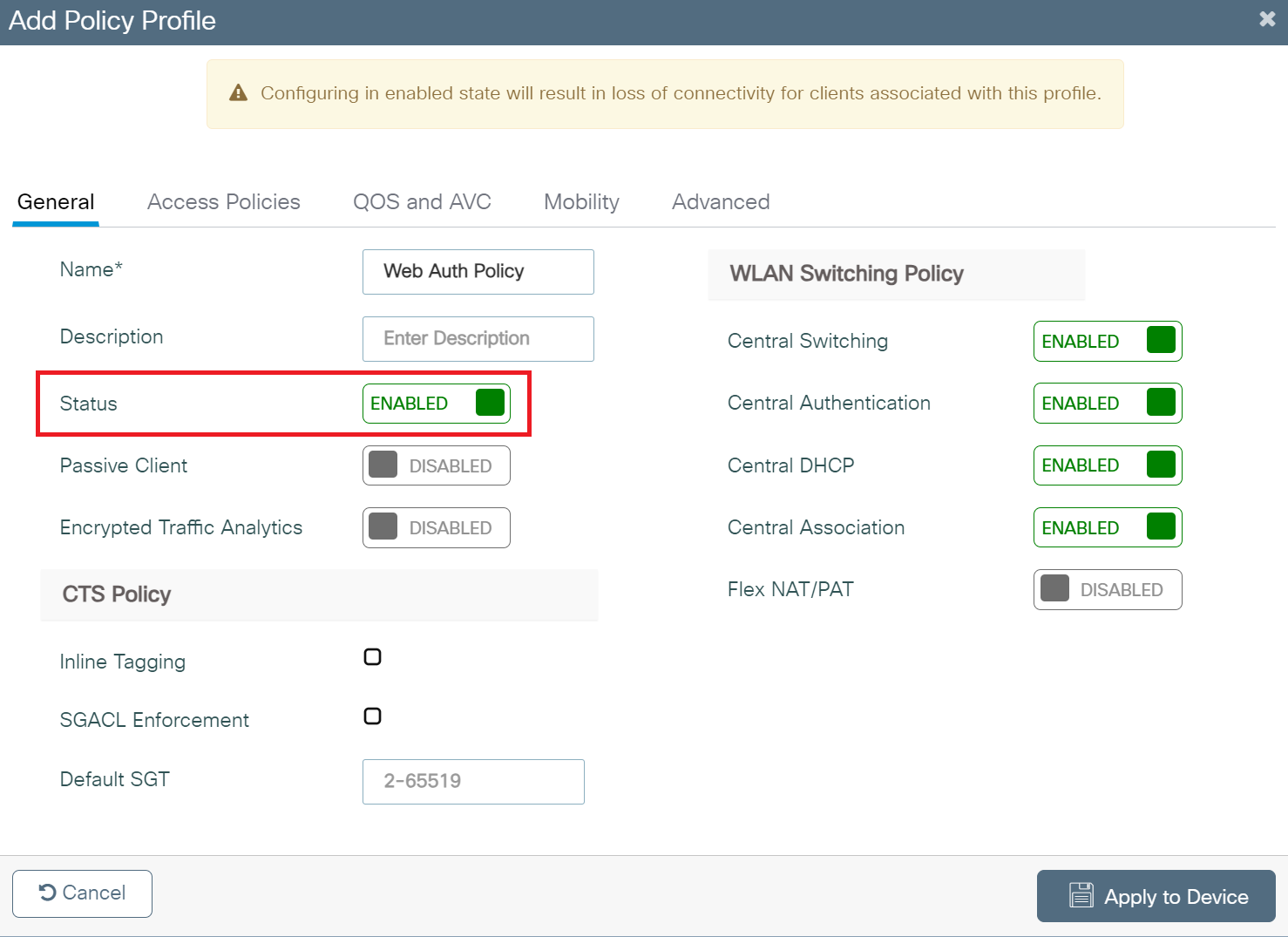 - From the Policy Profile drop-down list, select the policy created in the Creating a Policy Profile section.