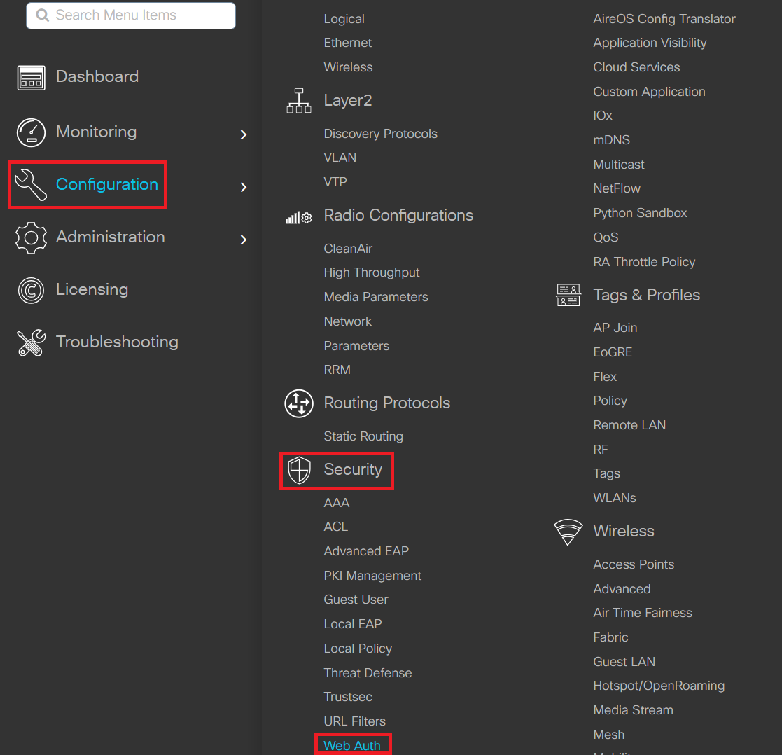 The following are the high-level steps to be configured on the Cisco wireless controller to enable Web Authentication: