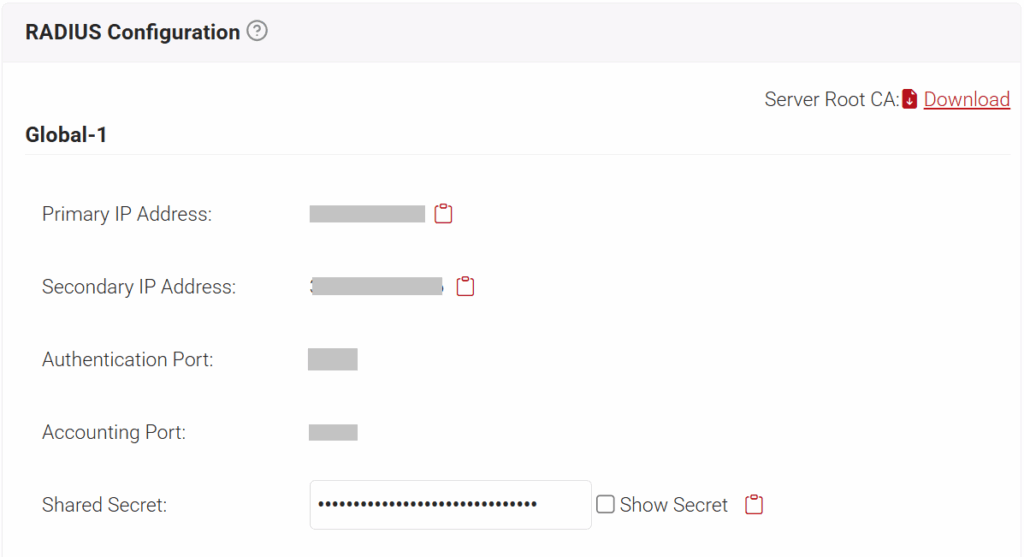 - In the Authentication Server window, update the following settings with information from the JoinNow Management Portal under RADIUS > RADIUS Configuration. Copy the required IP address and Port numbers: