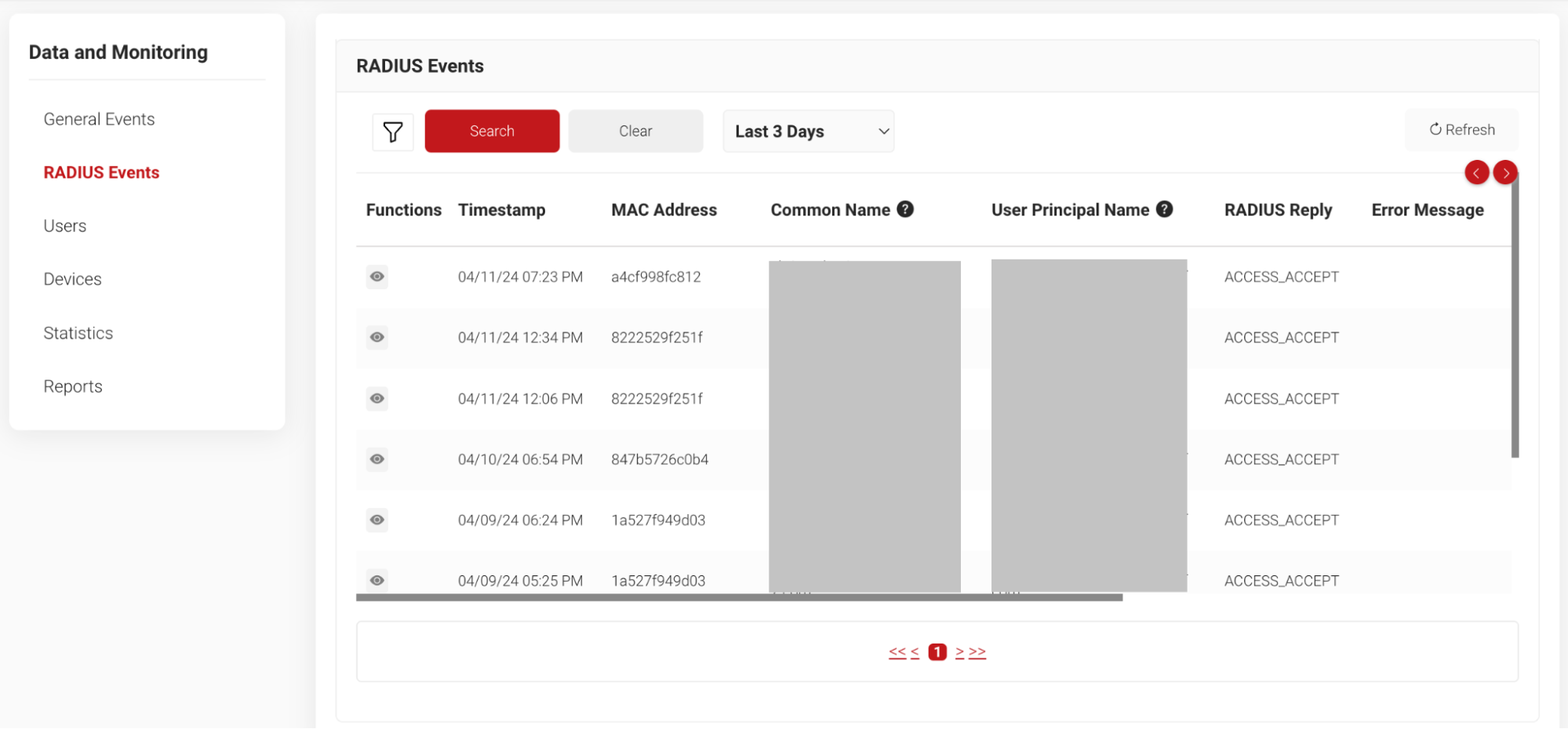 With the above successful configuration, the setup is ready for RADIUS authentication. The RADIUS authentication requests from the devices are logged on the RADIUS Events section of the JoinNow Management Portal. To access the RADIUS Events page, log in to the JoinNow Management Portal and navigate to Data and Monitoring > RADIUS Events.