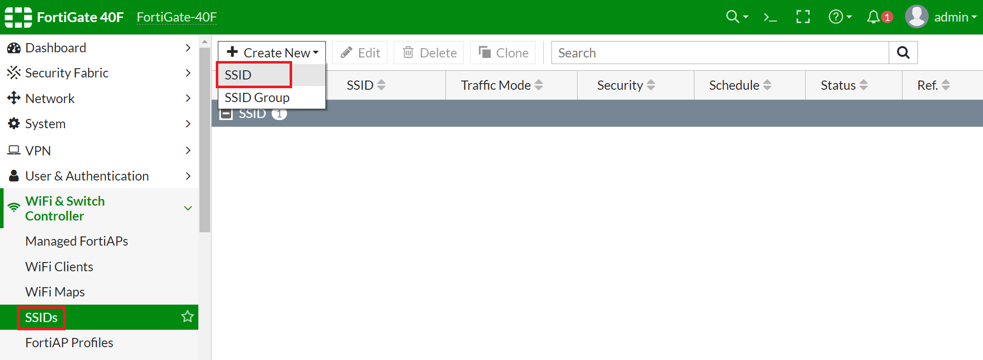 - From the Create New drop-down menu, select SSID.