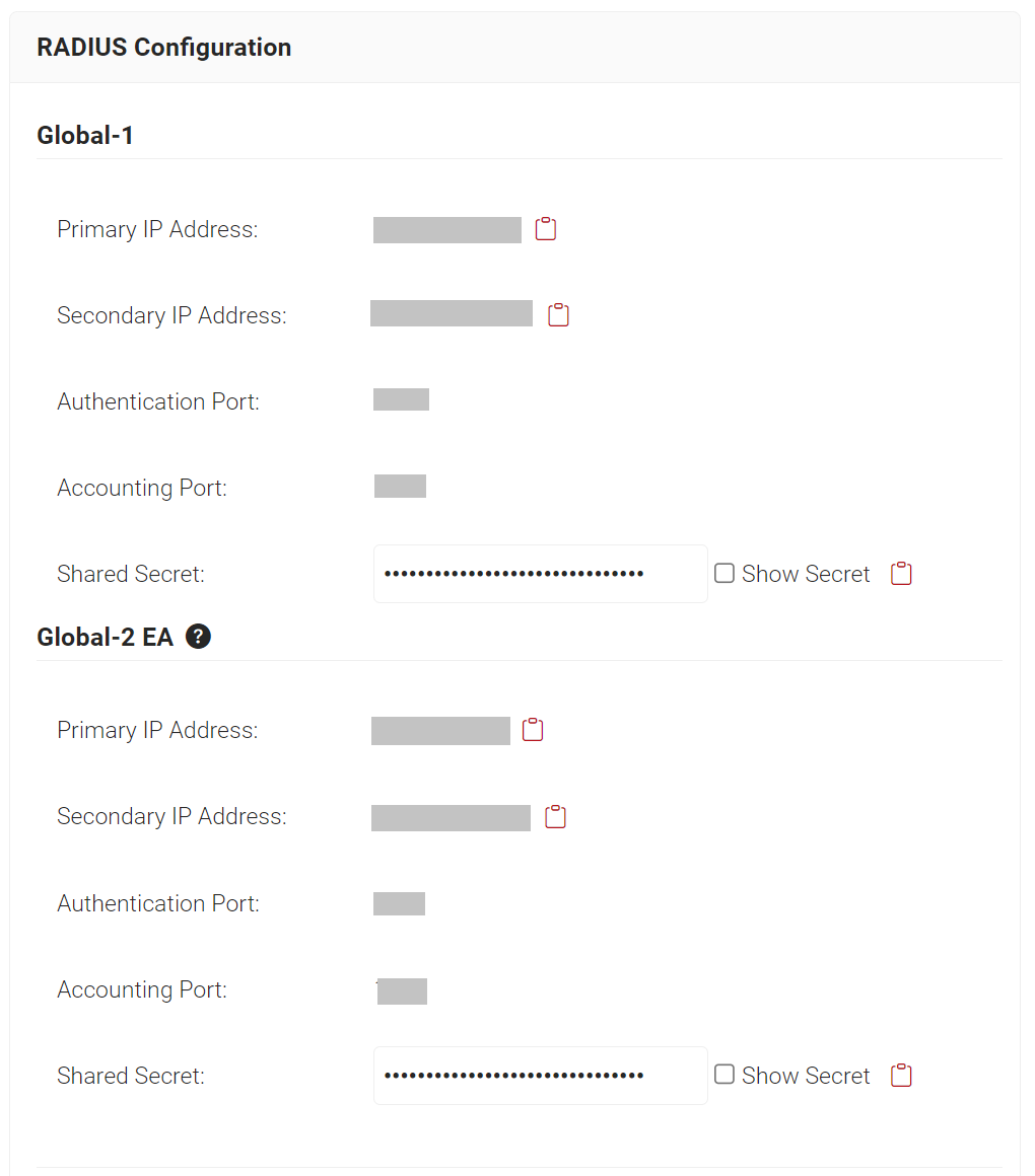 - Copy the Primary IP Address, Secondary IP Address, and Shared Secret values from Global-1 to your console.