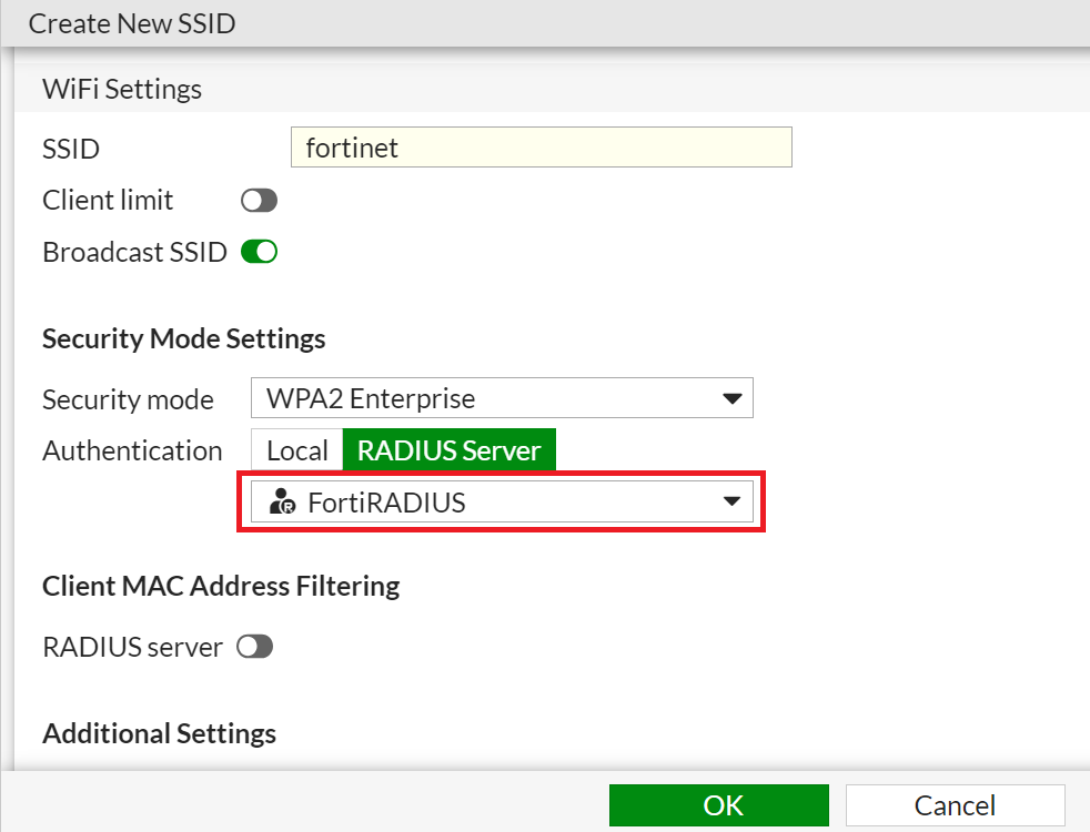 NOTE: Configuring the CloudRADIUS port number on the FortiGate controller is a global change.config system global set radius-port <port number> end - From the Authentication drop-down list, select the RADIUS server created earlier.