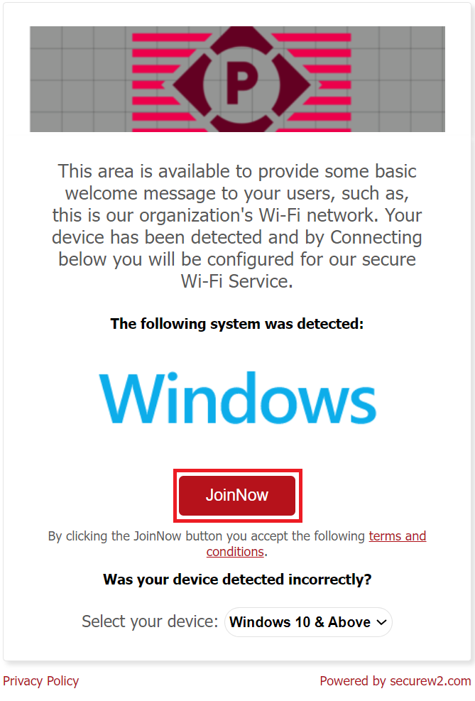 On the User Onboarding page, the corresponding OS is displayed based on the device’s OS. Below is the sample onboarding flow for the Windows OS platform.
