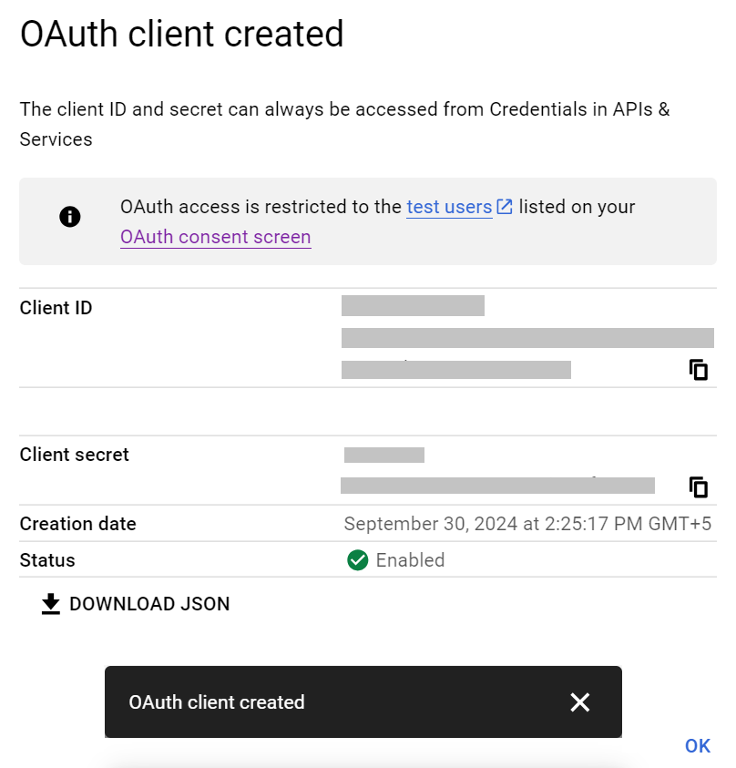 - In the Client Secret field, enter the Client secret obtained from the Google Console (refer to the Creating Authorization Credentials section, step 10).