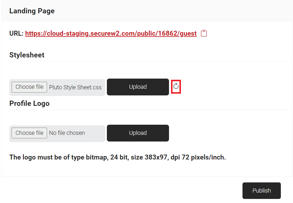 - When the Reset button is clicked, the uploaded .css stylesheet is removed from the Stylesheet section, and the customized Guest Landing Page is restored to its default state.