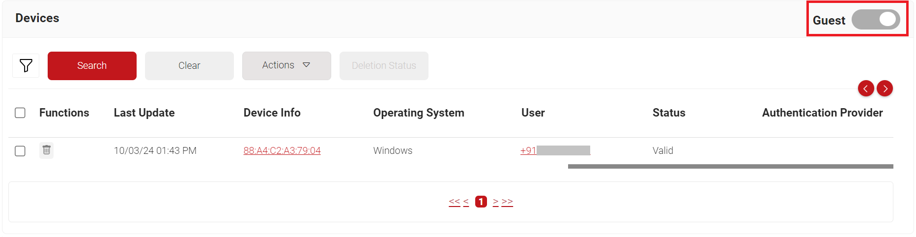 The enrolled guest devices and their details can be tracked on the Devices page in the JoinNow Management Portal. To view the Guest device details, navigate to Data and Monitoring > Devices and disable the Managed toggle button.