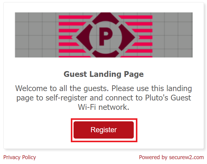 During device onboarding, the user is redirected to the Guest Landing Page. When the Register button is clicked, the user is directed to the User Onboarding page.