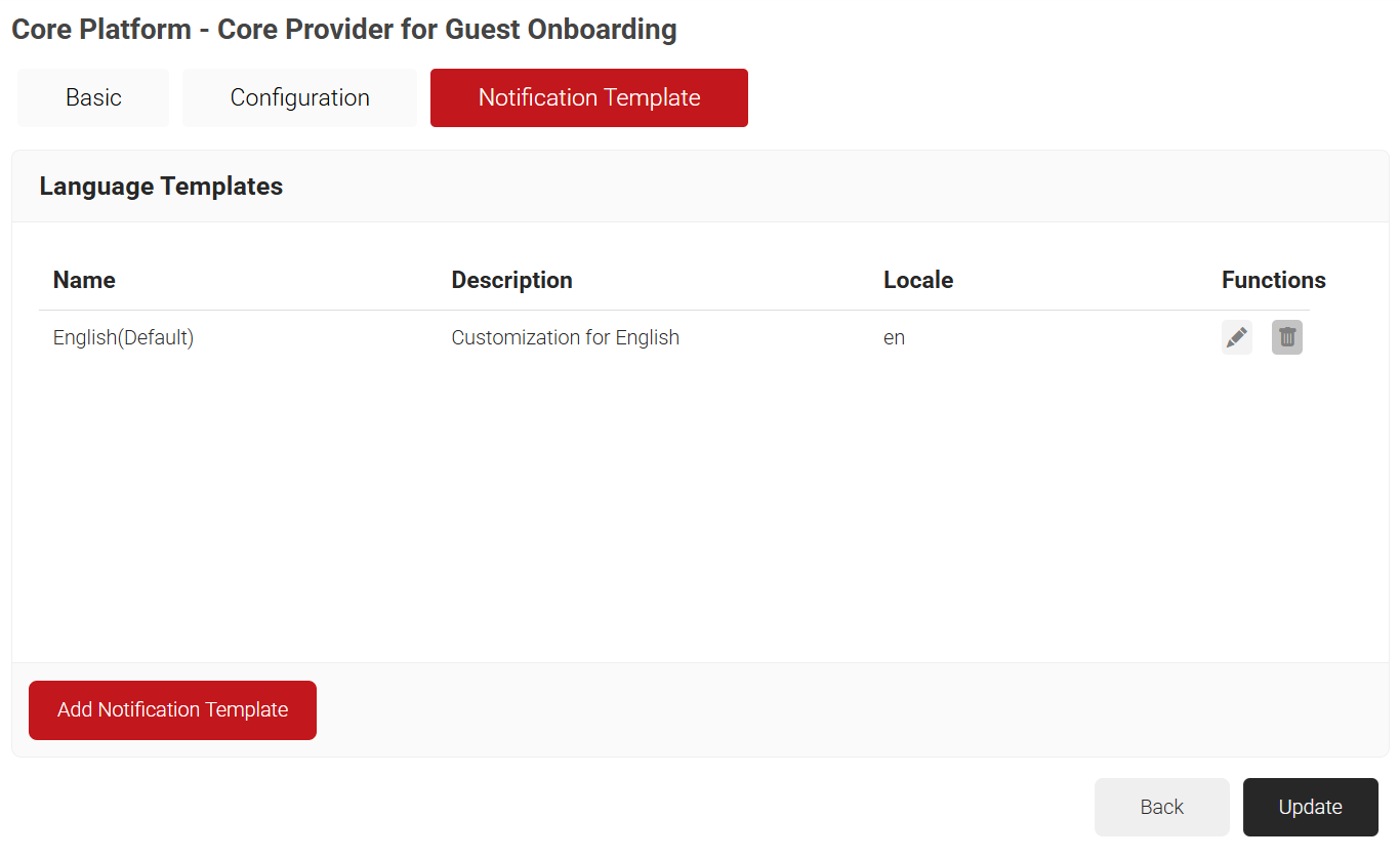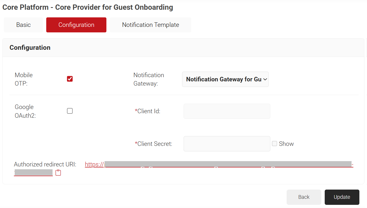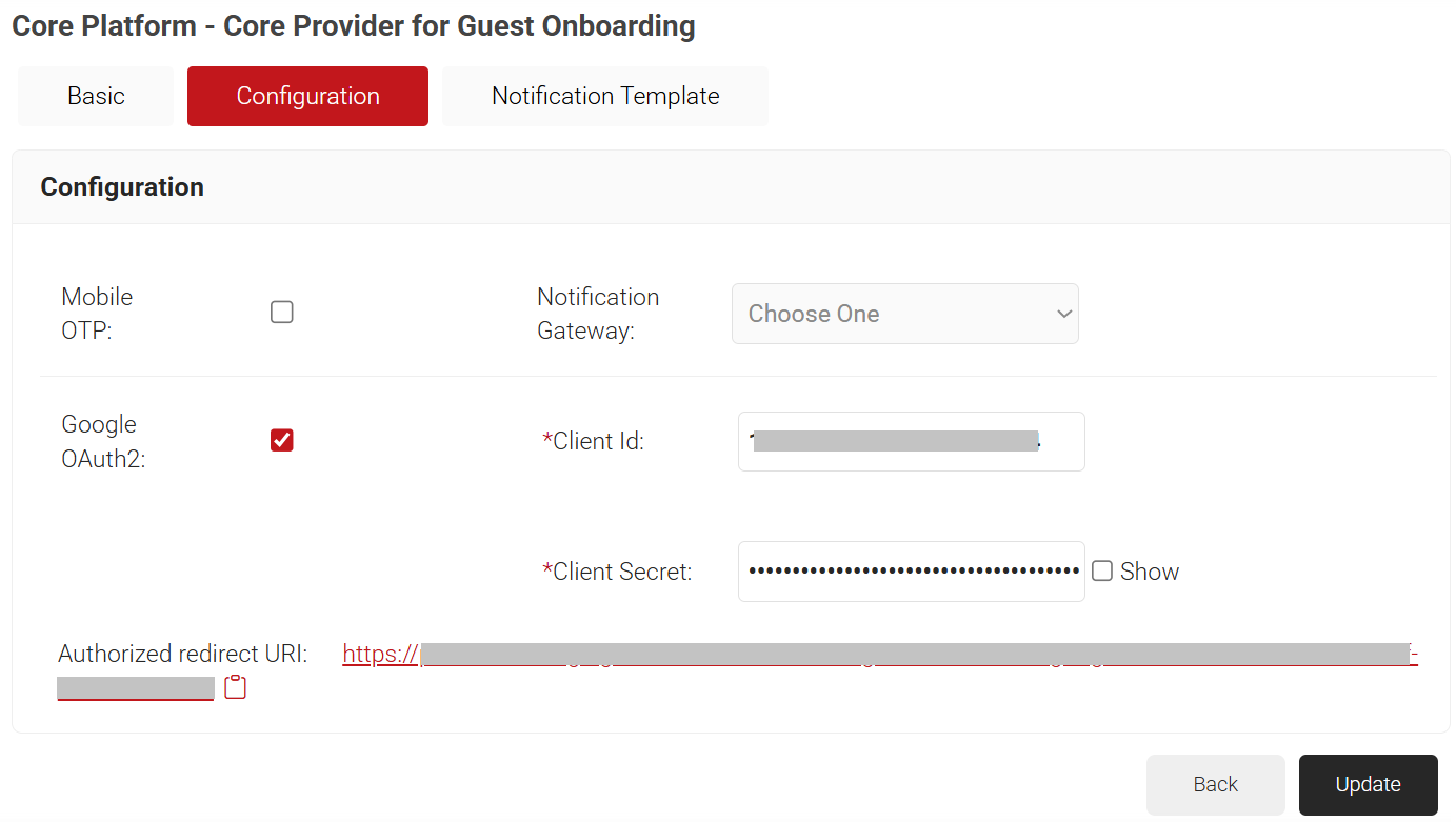 - Click Save. The page refreshes, and Configuration, and Notification Template tabs are displayed.