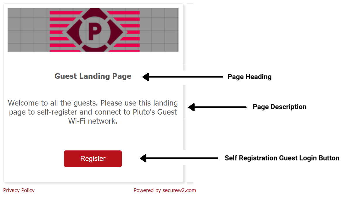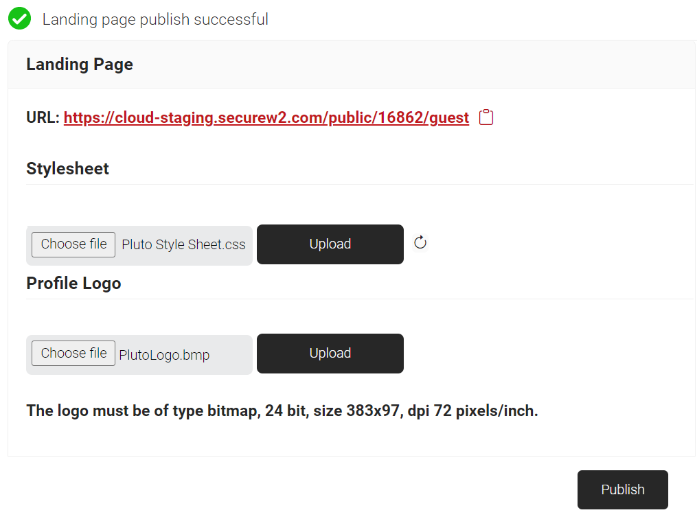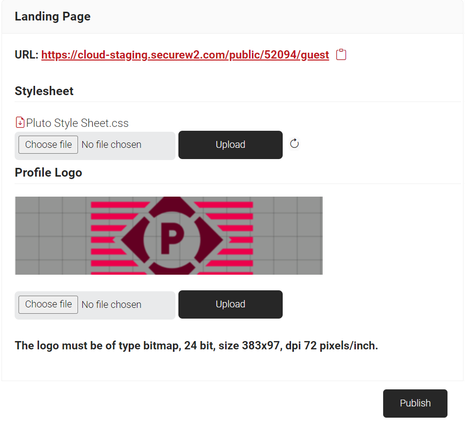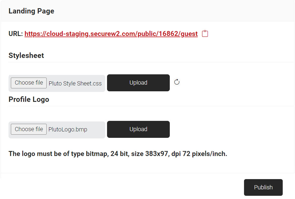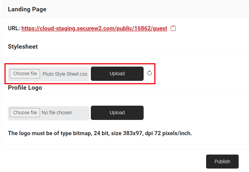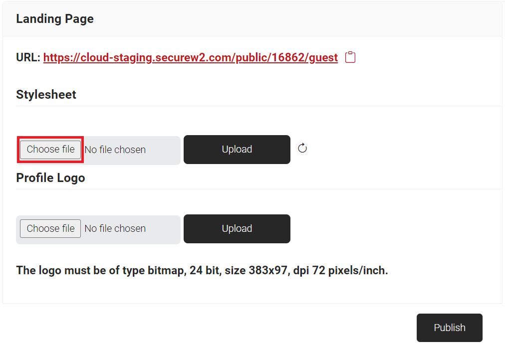 - To customize the Guest Landing page design, download the .css file from https://cloud.securew2.com/public/<Organization Code>/guest/css/main.css, edit the file, and then upload it by clicking the Choose file button. The maximum size for a .css file that can be uploaded in the stylesheet section is 100 KB. This URL is also available on the Landing Page.