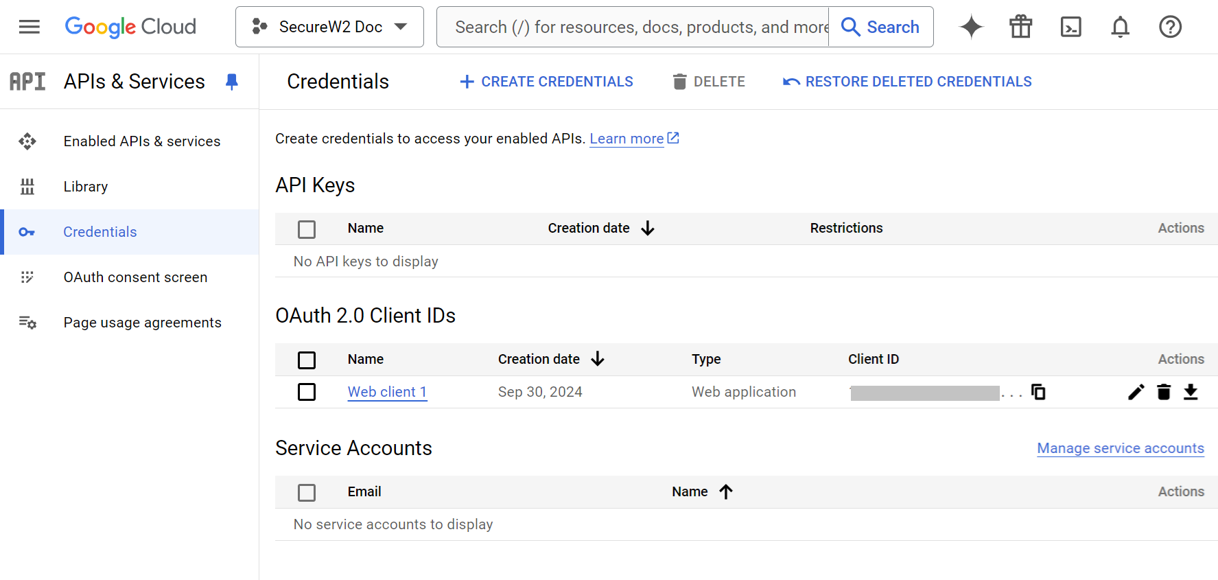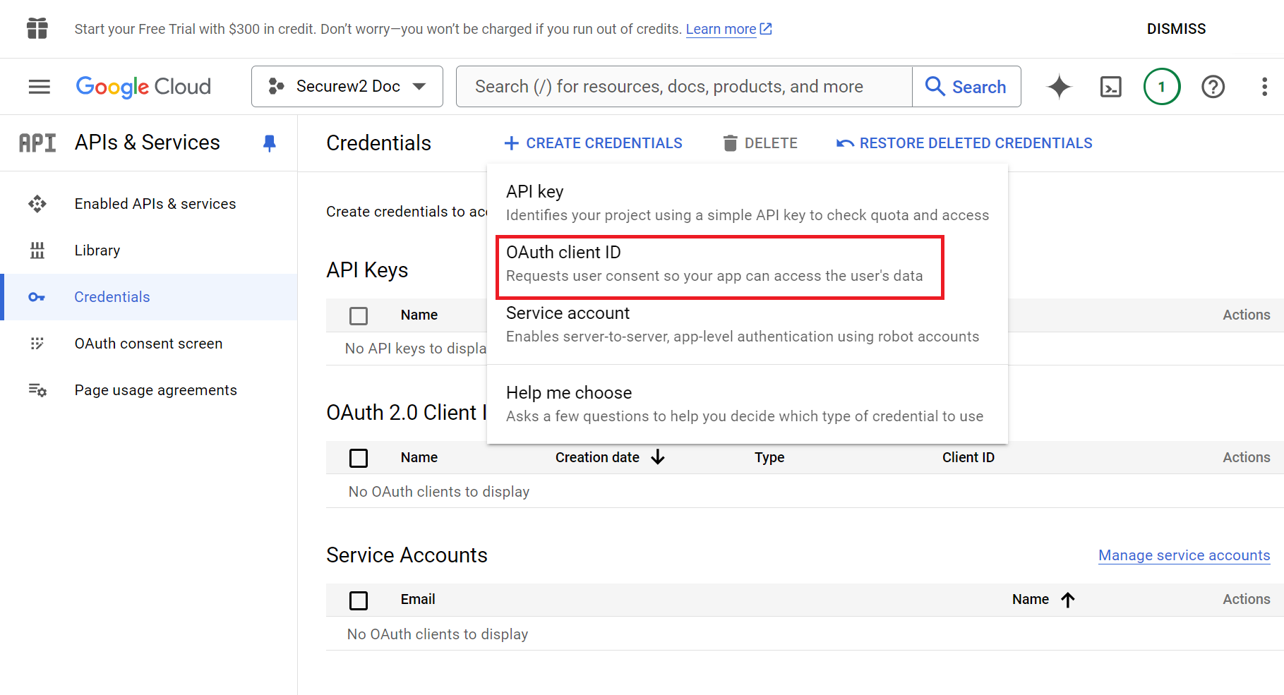 - Click the + CREATE CREDENTIALS menu and select OAuth client ID.