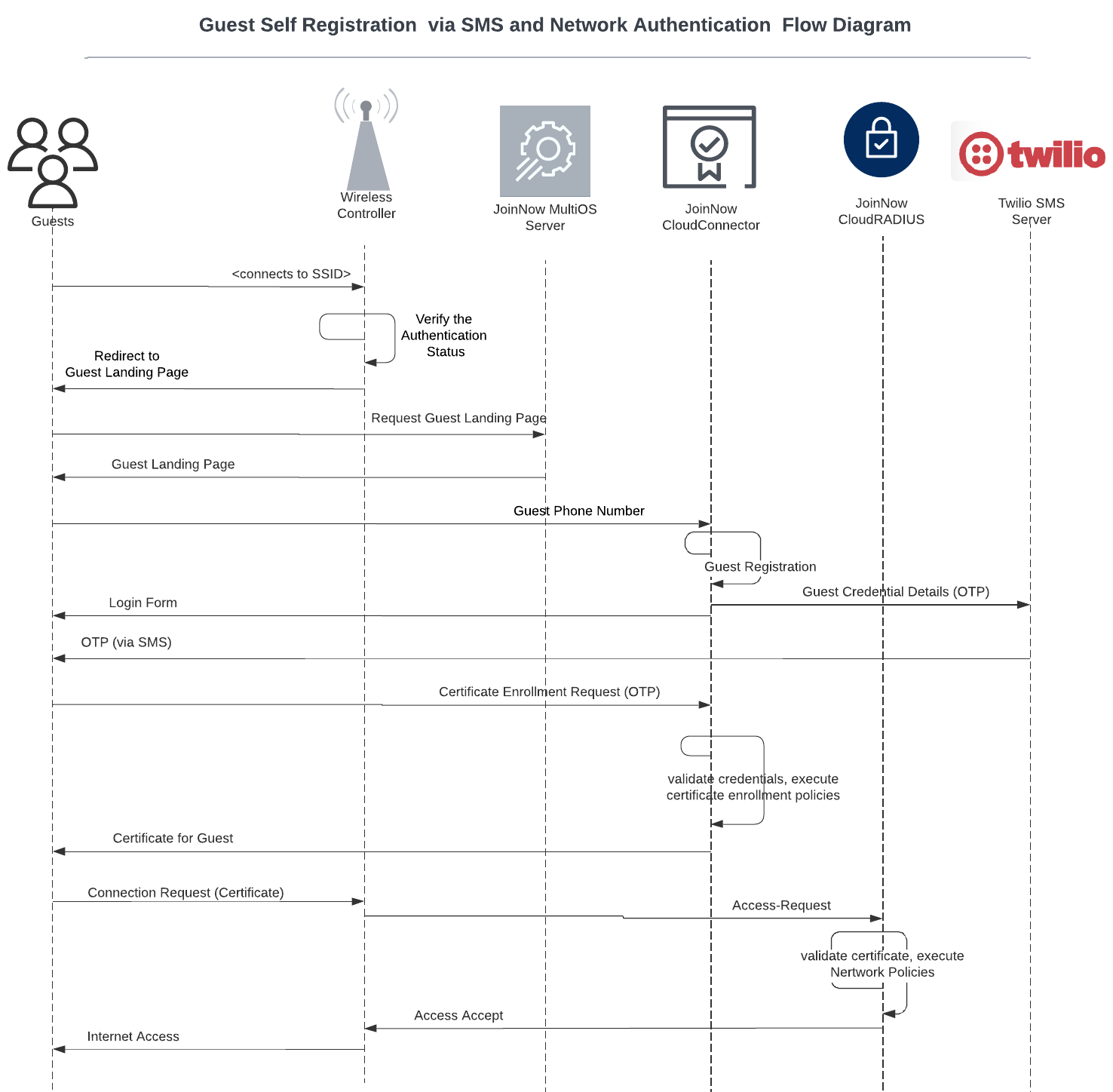 SecureW2 currently supports integration with Twilio to send OTPs via SMS for mobile number-based guest registrations.