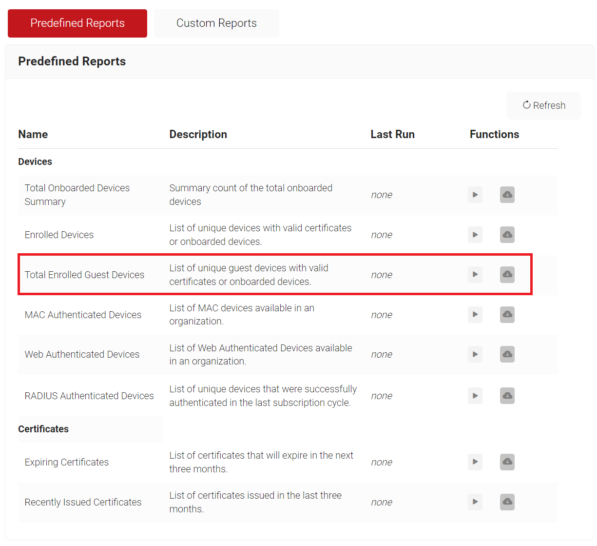A new report type named “Total Enrolled Guest Devices” has been added to the Predefined Reports page to track enrolled guest devices. To view the Total Enrolled Guest Devices report, navigate to Data and Monitoring > Reports > Predefined Reports.