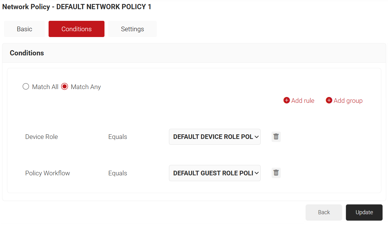 - From the Device Role Equals drop-down list, ensure that the DEFAULT DEVICE ROLE POLICY 1 is selected.