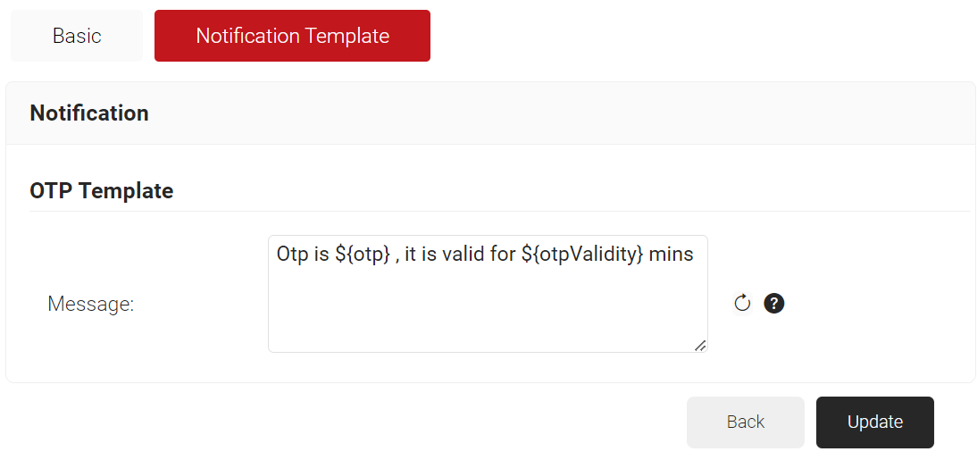 - In the Message field, enter the customized message format with the OTP value that can be sent to users during the enrollment process. Ensure to retain “${otp}” and “${otpValidity}” variables in the message, as they convey the OTP value and its validity, respectively.