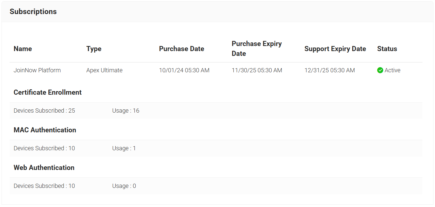 The values in the Onboarded Devices field under the Subscriptions section display the number of devices with valid certificates that were onboarded via Guest with the TLS feature.