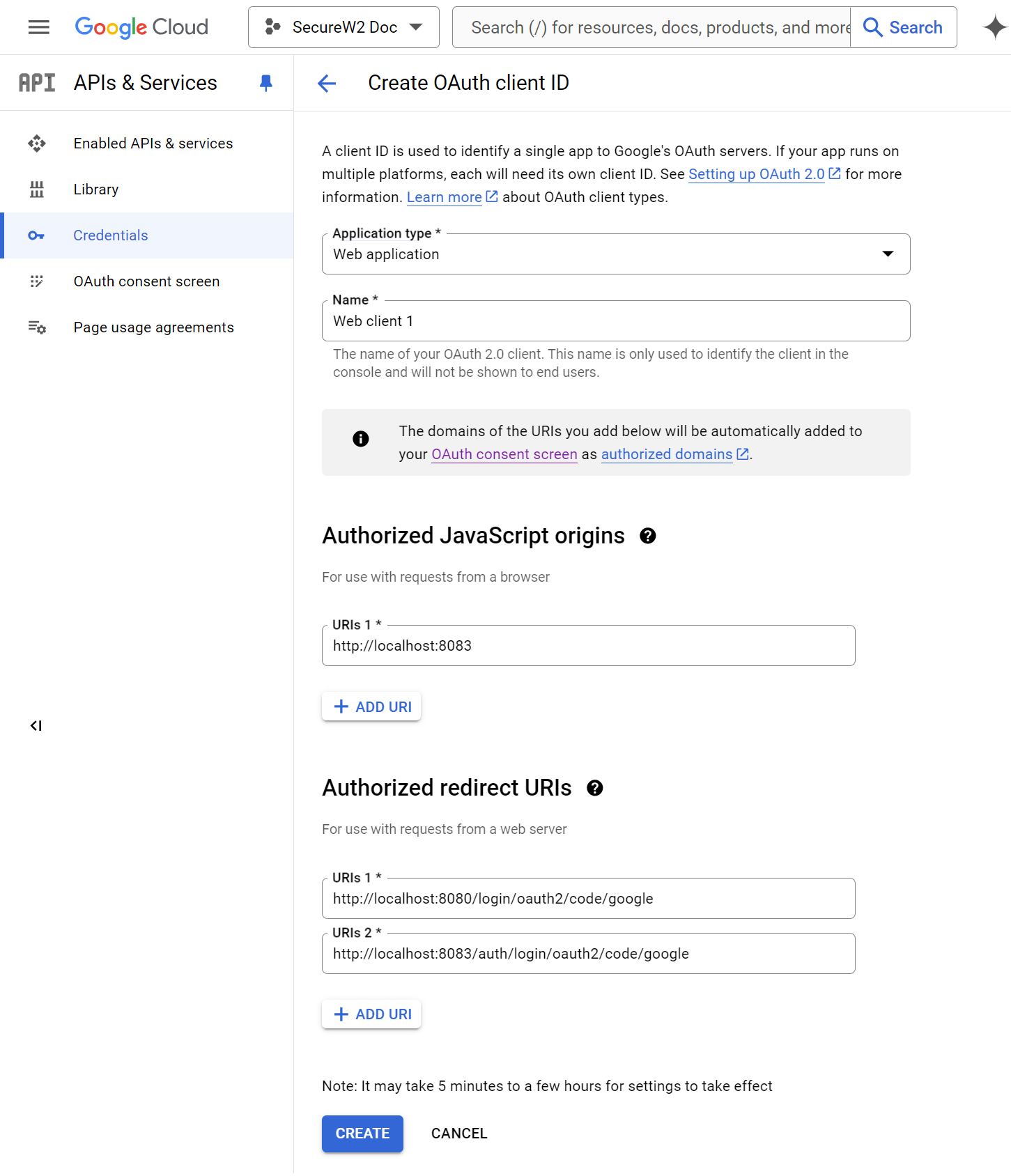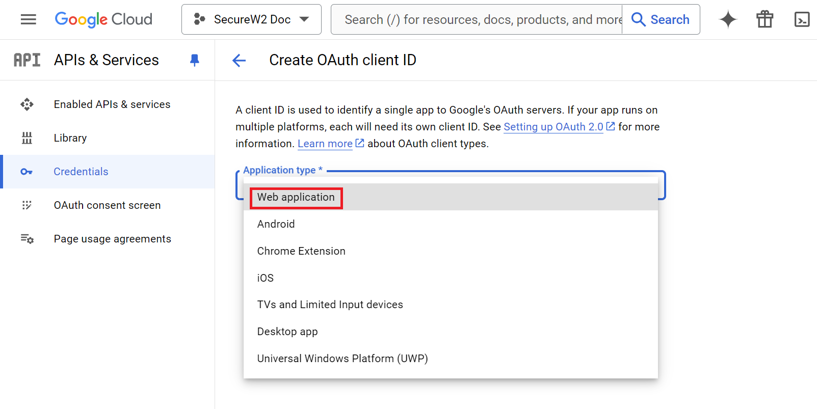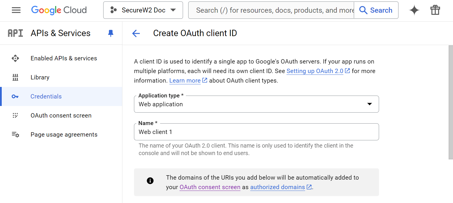 - On the Create OAuth client ID page, from the Application type drop-down list, select Web application.