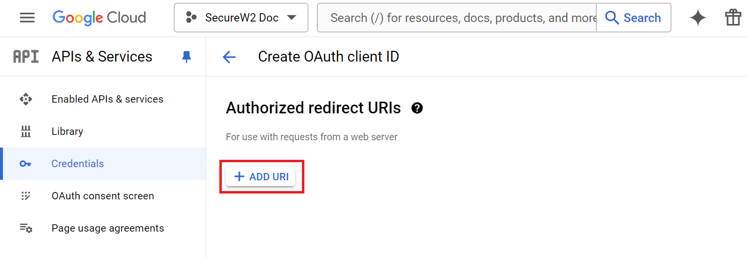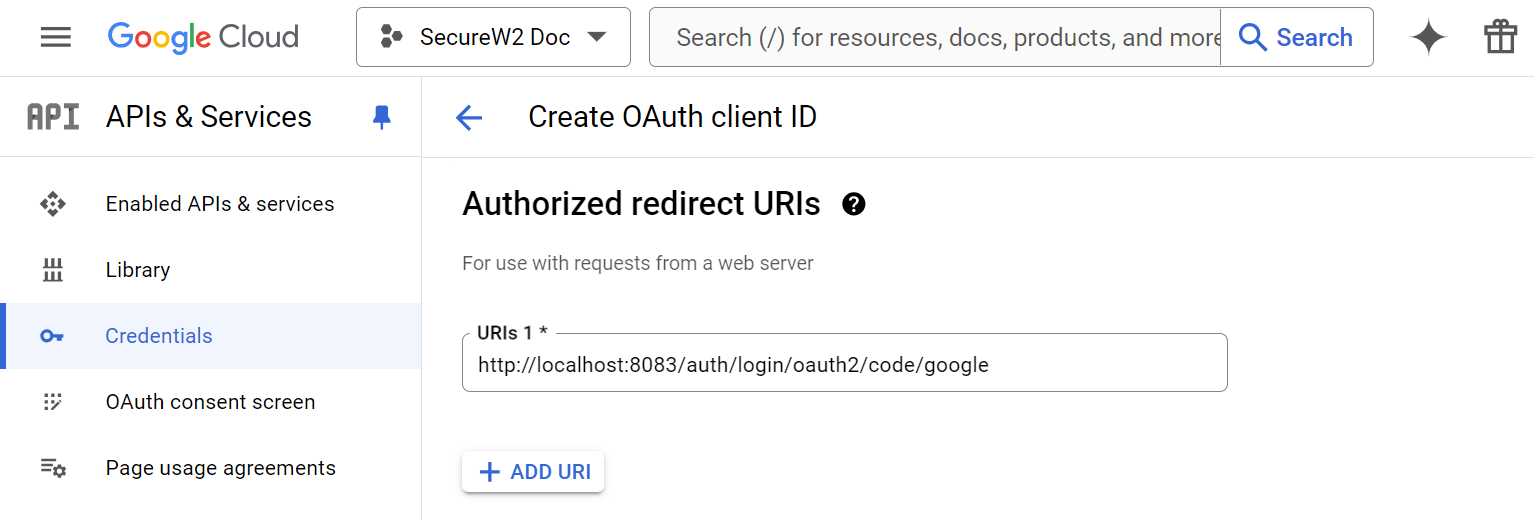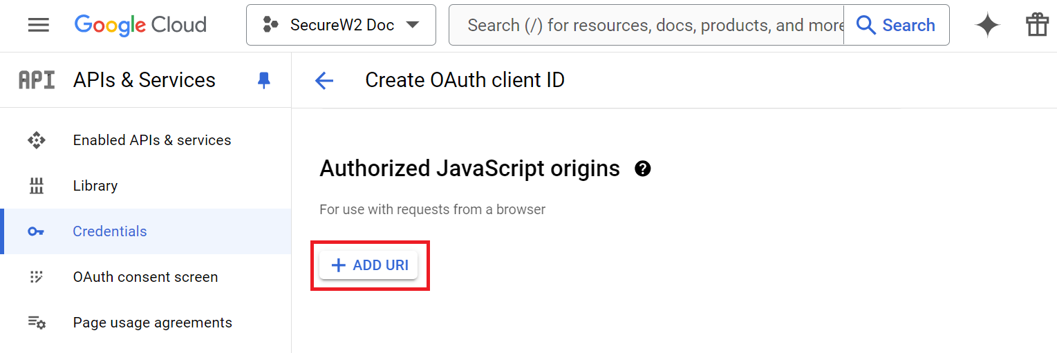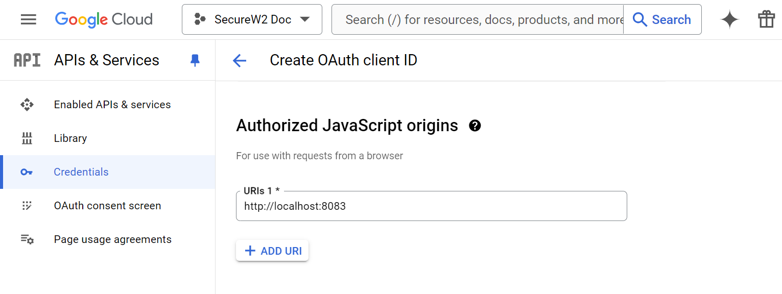 - In the Authorized JavaScript origins section, click the ADD URI button.
