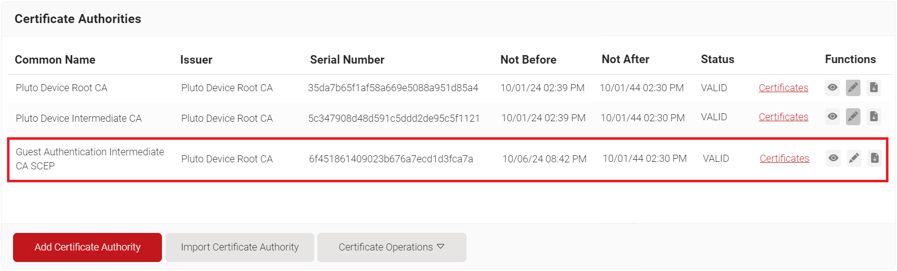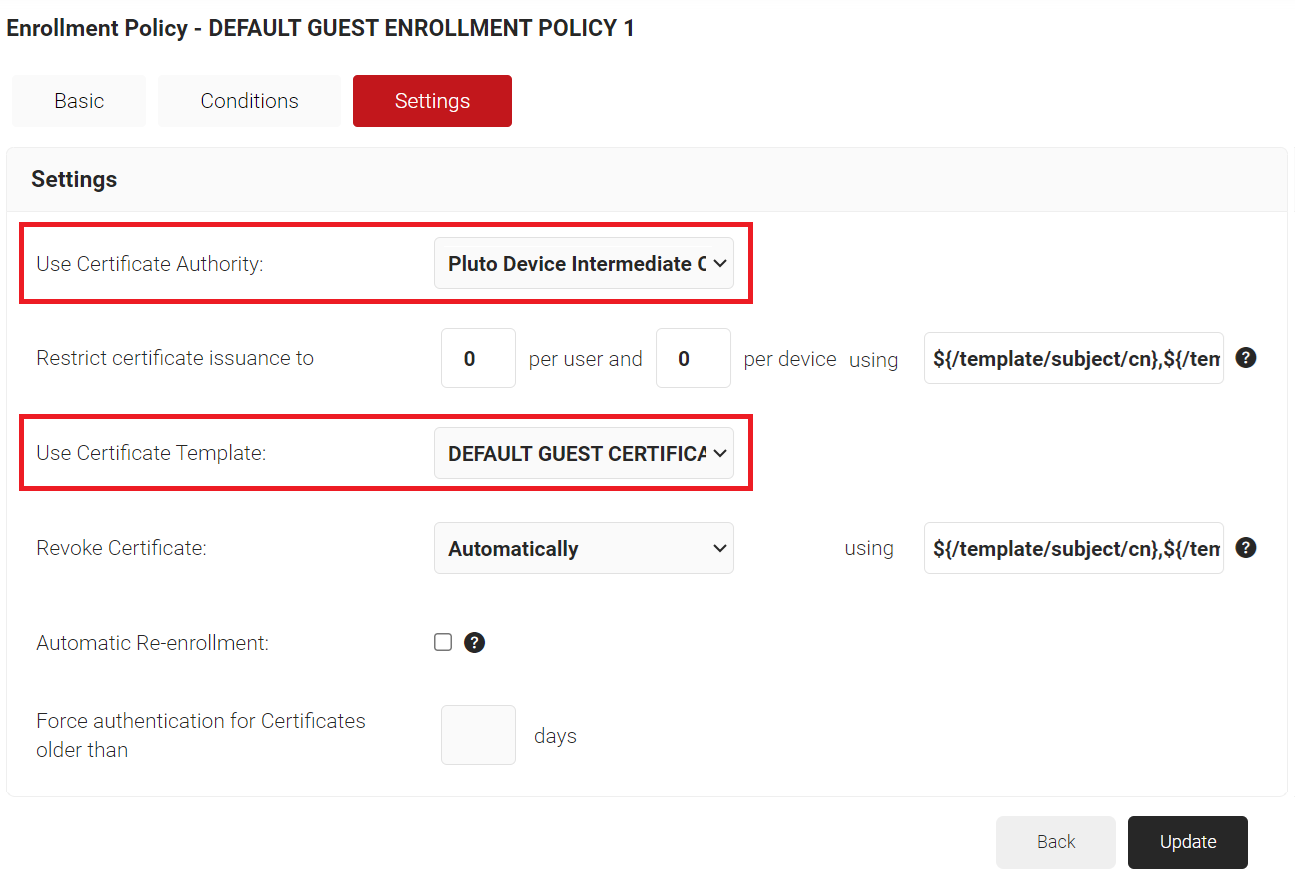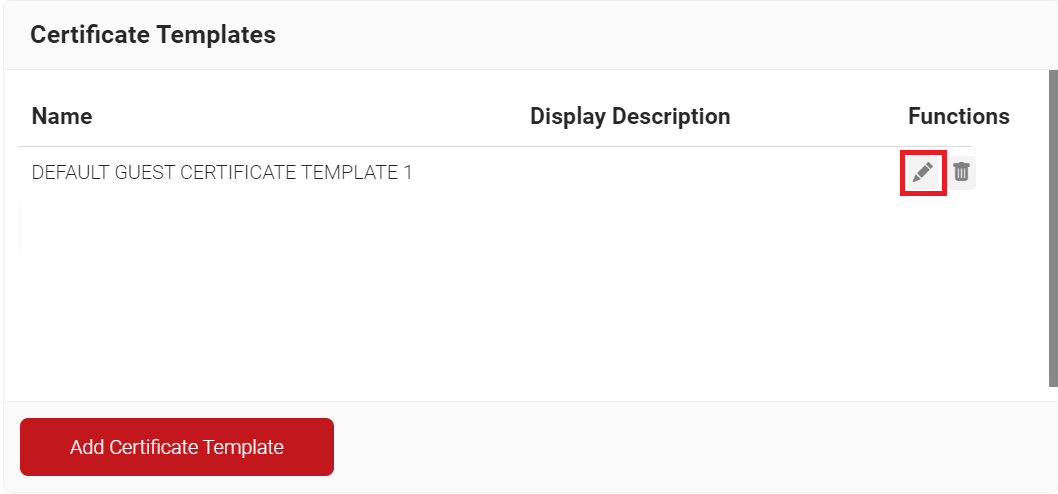 - Scroll to the Certificate Templates section, and then click Edit on the DEFAULT GUEST CERTIFICATE TEMPLATE 1.