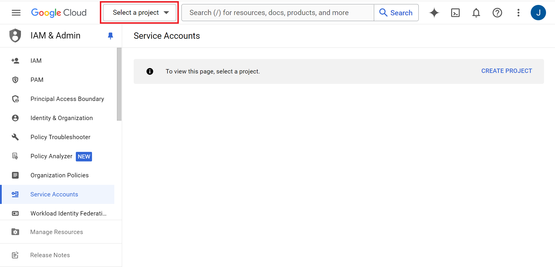 The Google Service Account must be created in the IAM & Admin console. Log in to the Google IAM & Admin console using the link here.