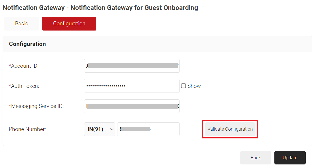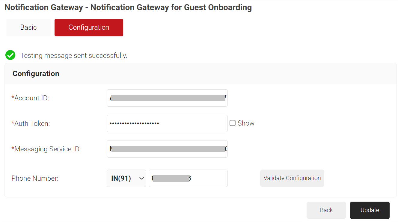 - Click the Validate Configuration button to check the validity of the phone number entered.