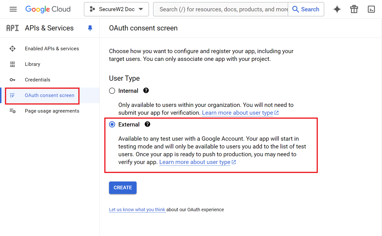 - On the OAuth consent screen, select External to make the app available to all users outside the organization.