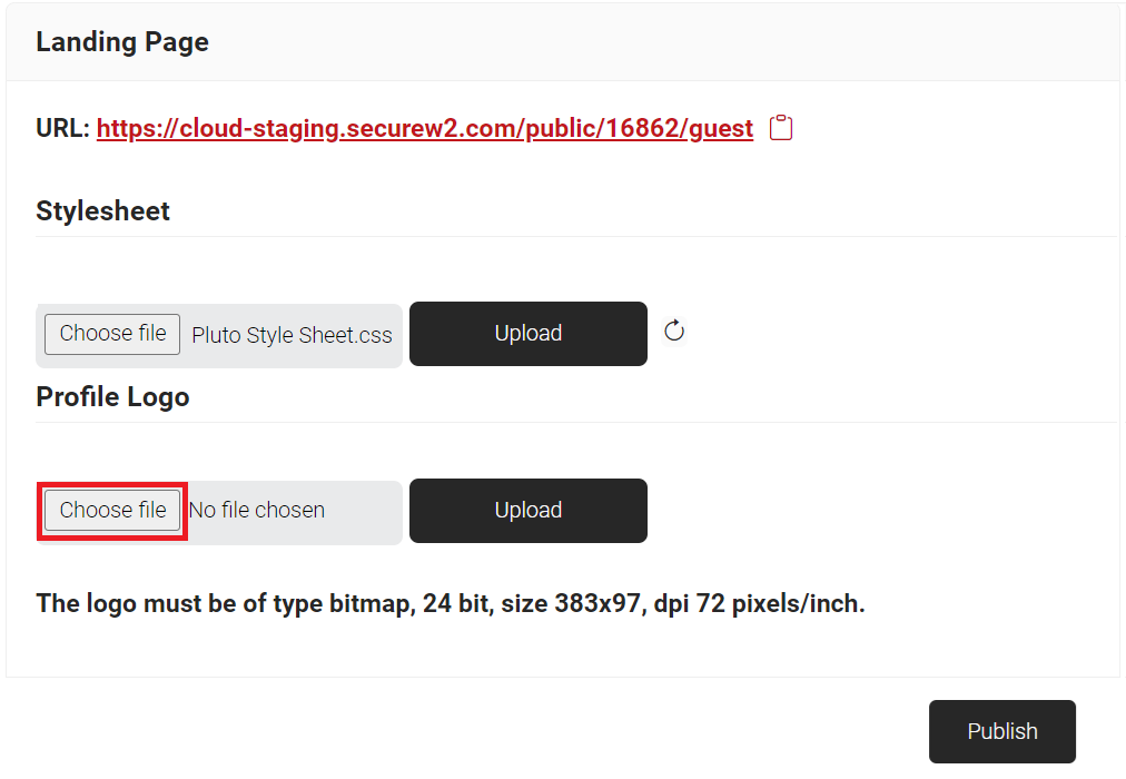 - Click the Choose file button and select the logo for the landing page. The logo must be a bitmap image, 24-bit, with dimensions 383×97 and a resolution of 72 pixels per inch.