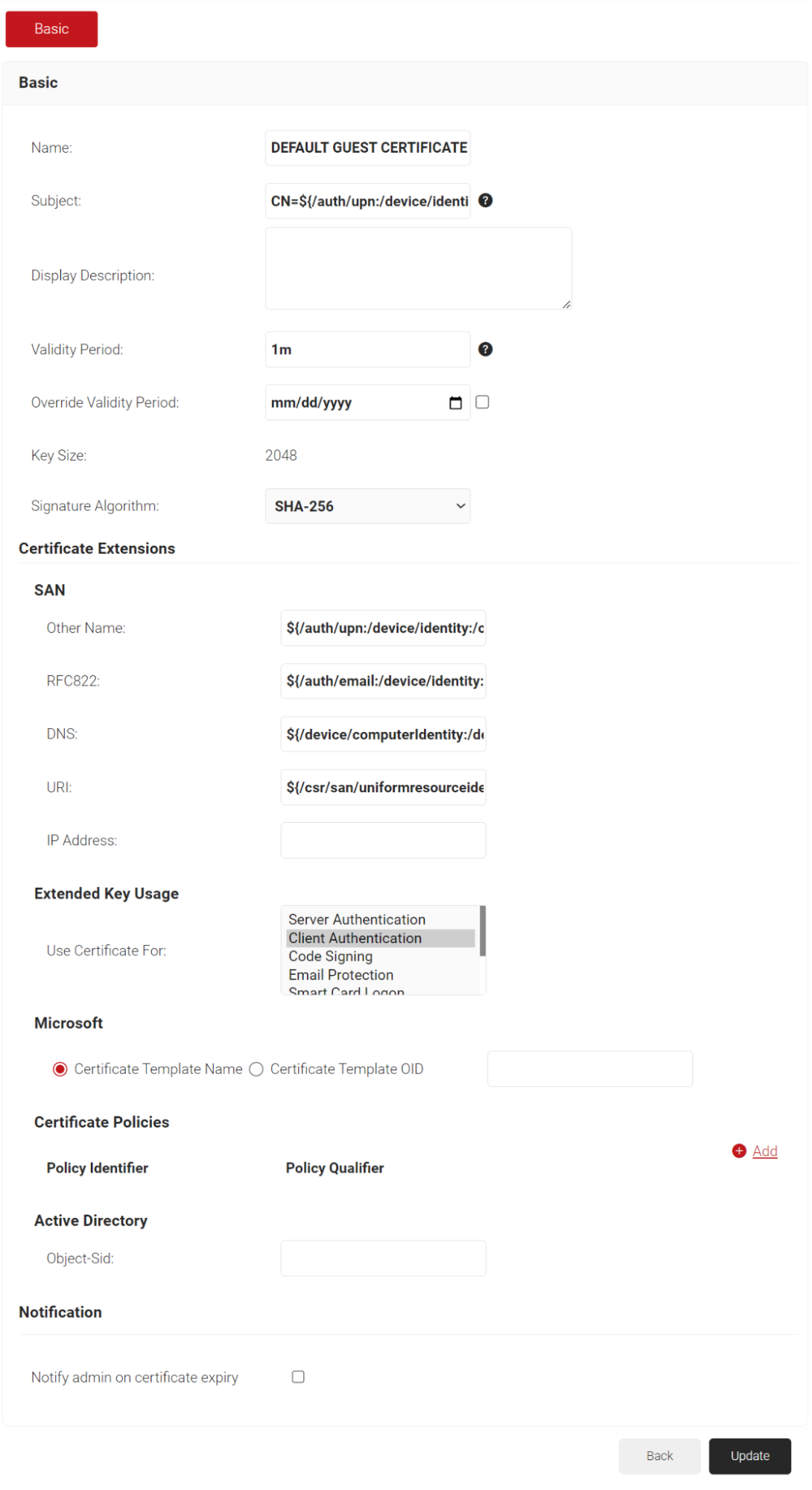 - In the Subject field, retain the default value CN=${/auth/upn:/device/identity} hardcoded in the certificate template.