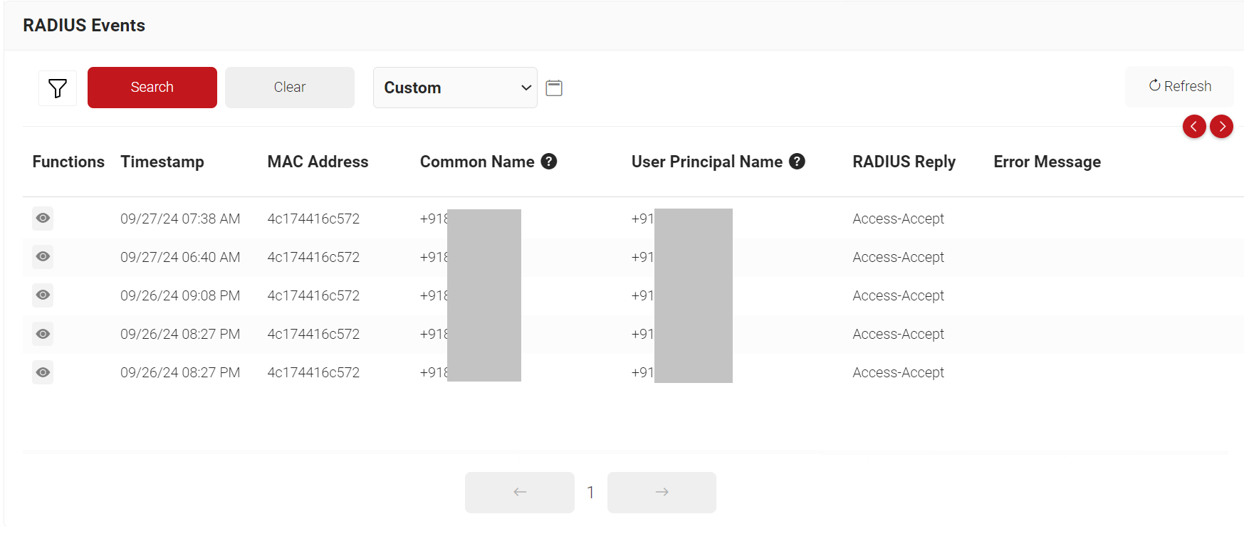 Wi-Fi Authentication events for guests are available on the RADIUS Events page. To access the RADIUS Events page, log in to the JoinNow Management Portal and navigate to Data and Monitoring > RADIUS Events.