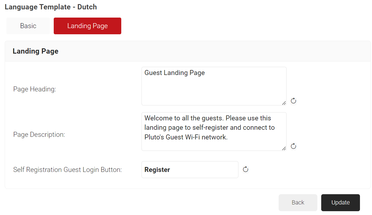 The Language Template allows the admin to customize the text on the guest authentication landing page. The landing page of the default language template can be modified, or new foreign language templates, such as Dutch, French, Italian, etc., can be created.