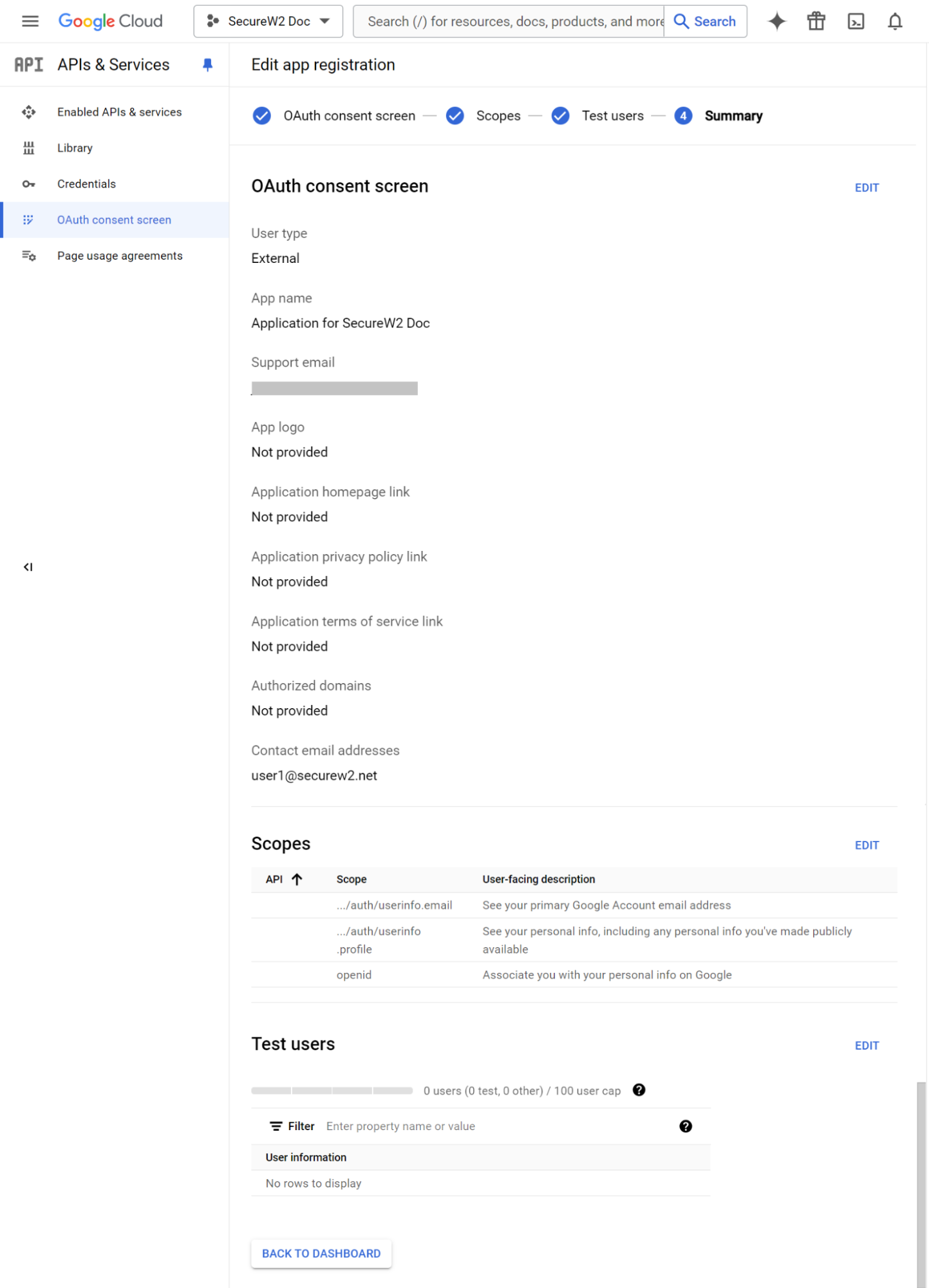 - On the Summary tab, review the app registration summary. To make changes, click EDIT. If the app registration details are correct, click the BACK TO DASHBOARD button.