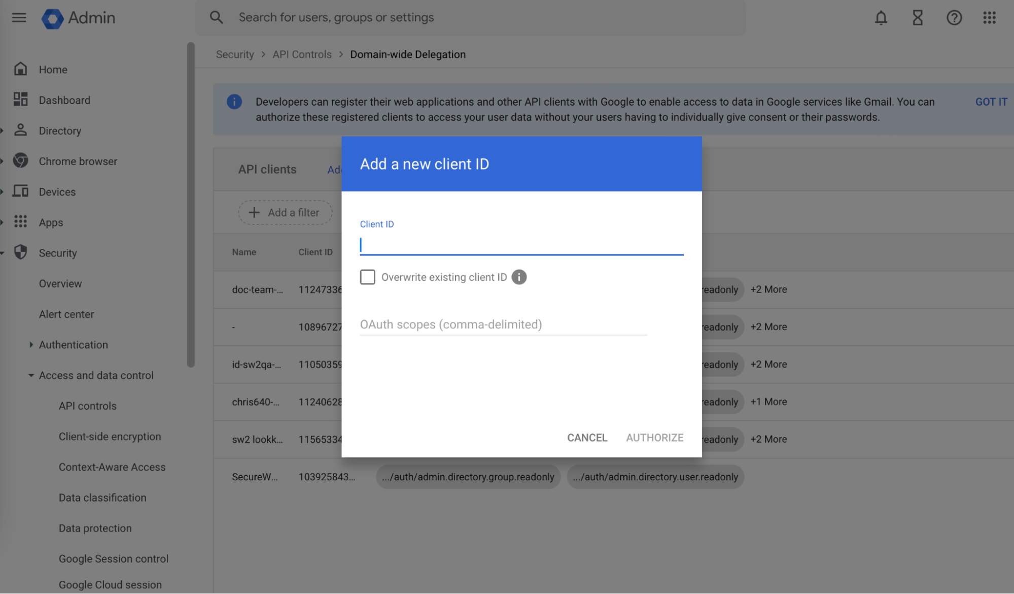 “https://www.googleapis.com/auth/admin.directory.user.readonly,https://www.googleapis.com/auth/admin.directory.group.readonly,https://www.googleapis.com/auth/admin.directory.device.chromeos.readonly,openid”. - Click Authorize.